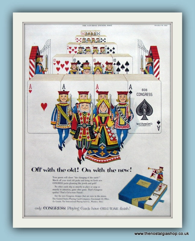 Congress Playing Cards. Only Congress cards have the Cel-u-tone finish! Original Vintage Advert 1953. Presented and Supplied in a 18 x 14 Inch cream mount with backing board and clear bag. Ready to Frame. All our adverts, unless clearly stated are Originals from the date shown. They make excellent pieces of wall art and stunning gifts. Many are rare and hard to find and once sold, may not be replaced. Remember you are buying a piece of history. Website watermarks are not on original. Adverts will be well packed with hardboard to keep rigid in the post.