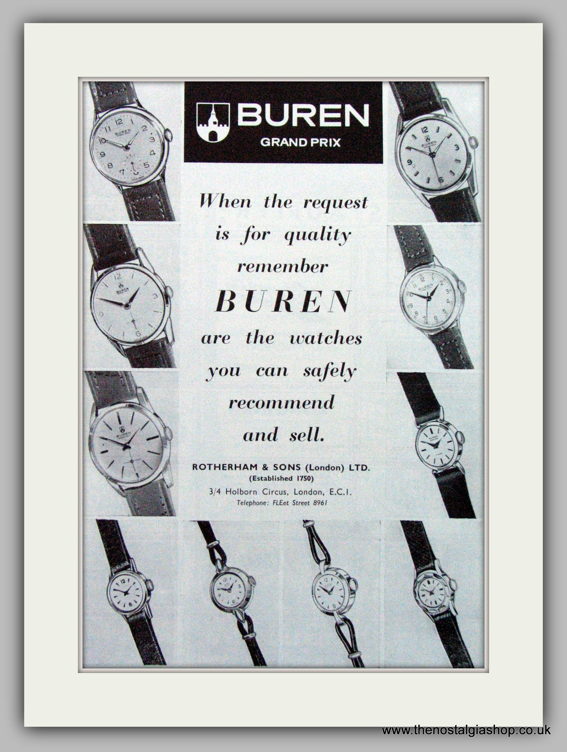 Buren Watches. When the request is for quality remember Buren. Vintage Advert. Classic original advert 1962. Presented in cream bevel cut mount with backing card and clear bag. Ready to fit in 14 x 11 inch frame. Want it framing? If so, buy this then go to Frames Available Category. Click to buy on the suitable frame and we will do the rest. All our adverts, unless clearly stated are Originals from the date shown. They make excellent pieces of wall art and stunning gifts. Many are rare and hard to find and once sold, may not be replaced. Remember you are buying a piece of history. Website watermark is not on original.