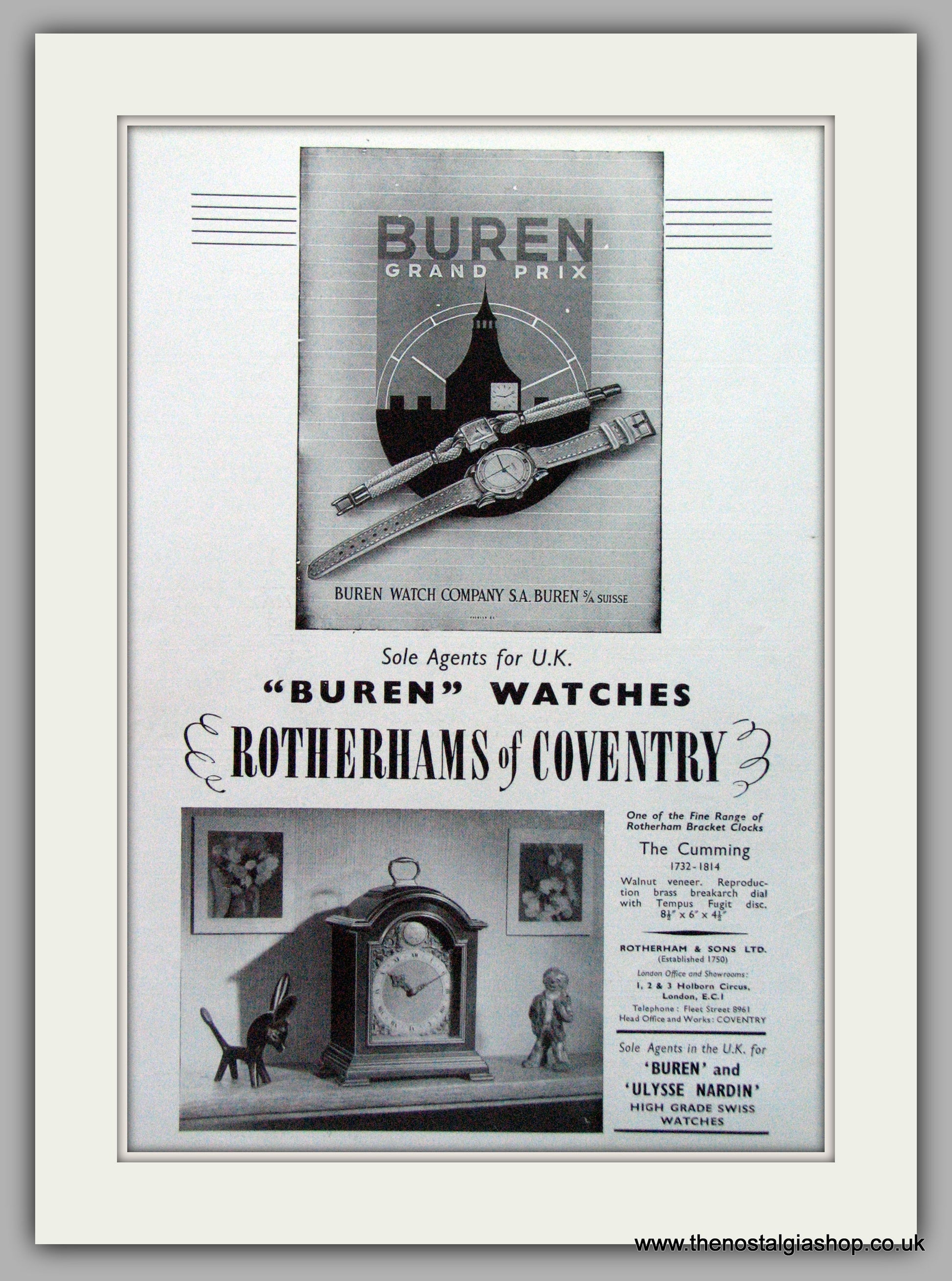 Buren Watches. High grade Swiss watches. Vintage Advert. Classic original advert 1957. Presented in cream bevel cut mount with backing card and clear bag. Ready to fit in 14 x 11 inch frame. Want it framing? If so, buy this then go to Frames Available Category. Click to buy on the suitable frame and we will do the rest. All our adverts, unless clearly stated are Originals from the date shown. They make excellent pieces of wall art and stunning gifts. Many are rare and hard to find and once sold, may not be replaced. Remember you are buying a piece of history. Website watermark is not on original.