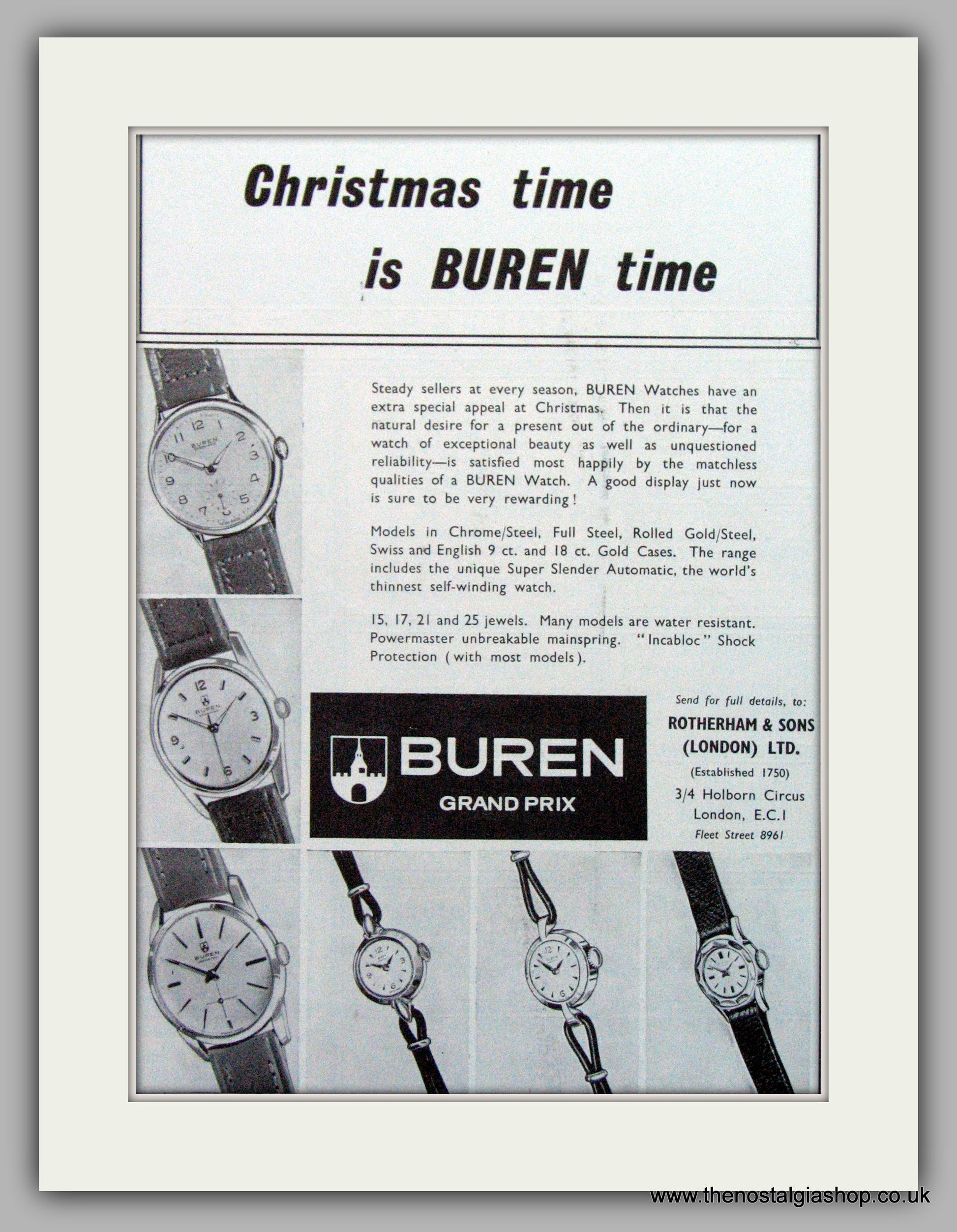 Buren Watches. Christmas time is Buren time. Vintage Advert. Classic original advert 1962. Presented in cream bevel cut mount with backing card and clear bag. Ready to fit in 14 x 11 inch frame. Want it framing? If so, buy this then go to Frames Available Category. Click to buy on the suitable frame and we will do the rest. All our adverts, unless clearly stated are Originals from the date shown. They make excellent pieces of wall art and stunning gifts. Many are rare and hard to find and once sold, may not be replaced. Remember you are buying a piece of history. Website watermark is not on original.
