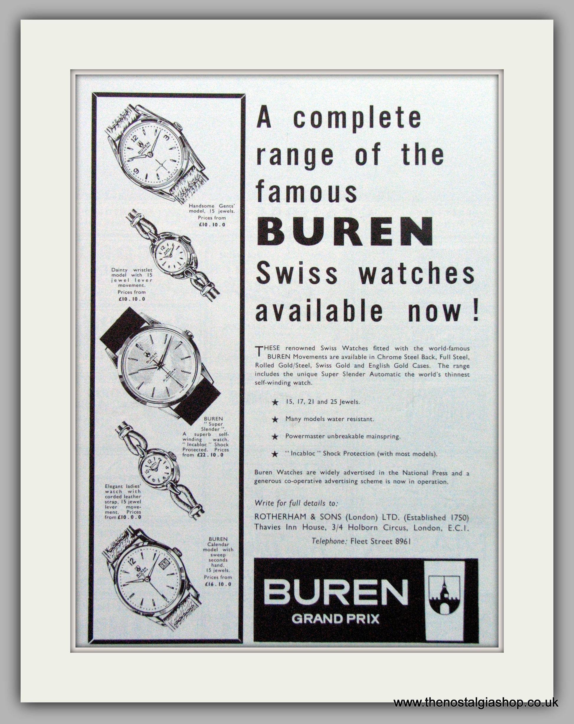Buren Watches. A complete range of the famous Buren. Vintage Advert. Classic original advert 1960. Presented in cream bevel cut mount with backing card and clear bag. Ready to fit in 14 x 11 inch frame. Want it framing? If so, buy this then go to Frames Available Category. Click to buy on the suitable frame and we will do the rest. All our adverts, unless clearly stated are Originals from the date shown. They make excellent pieces of wall art and stunning gifts. Many are rare and hard to find and once sold, may not be replaced. Remember you are buying a piece of history. Website watermark is not on original.