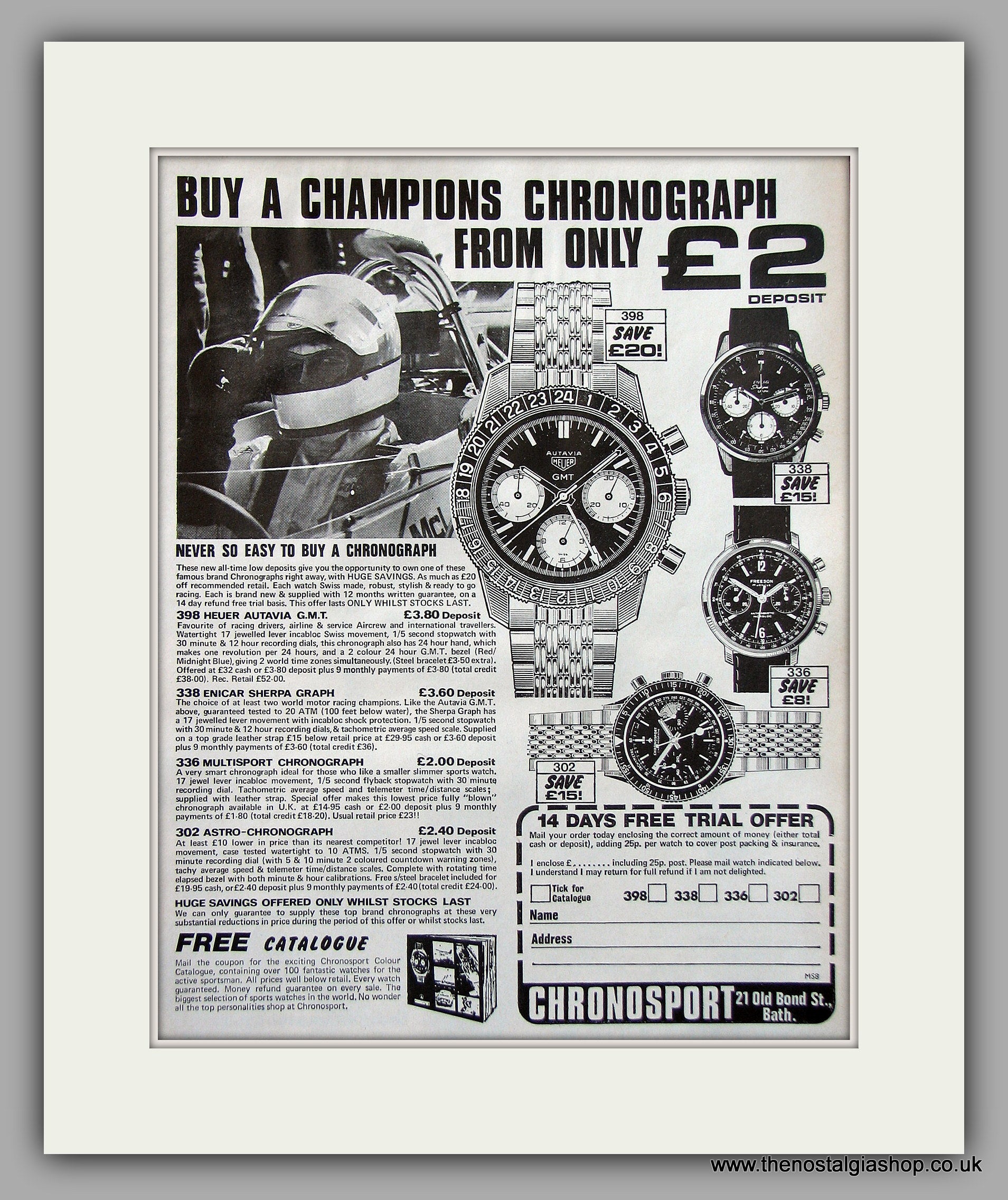 Chronosport watches. Buy a champions Chronograph from only £2 deposit. Vintage Advert. Classic original advert 1972. Presented in cream bevel cut mount with backing card and clear bag. Ready to fit in 14 x 11 inch frame. All our adverts, unless clearly stated are Originals from the date shown. They make excellent pieces of wall art and stunning gifts. Many are rare and hard to find and once sold, may not be replaced. Remember you are buying a piece of history. Website watermark is not on original.