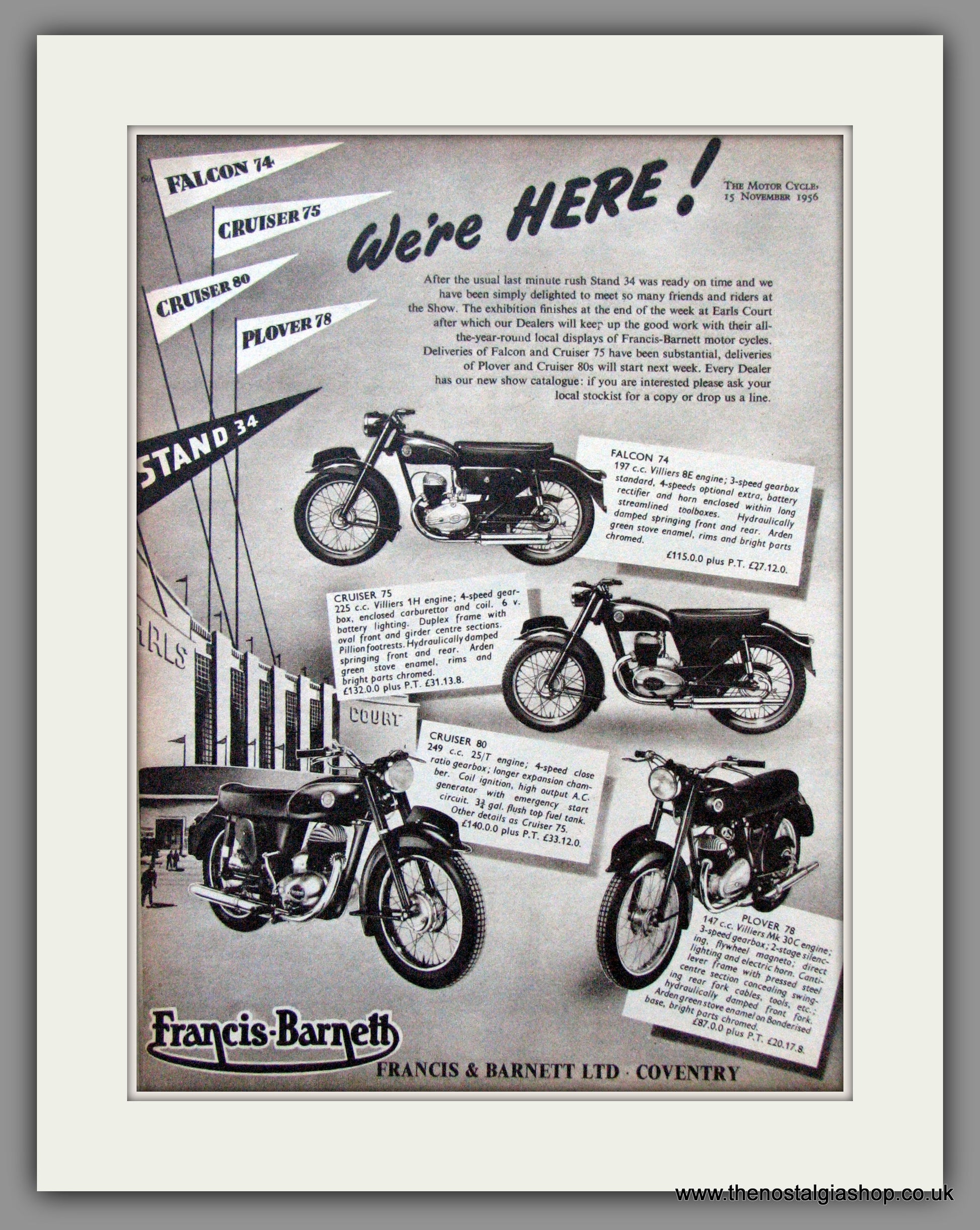 Francis Barnett Range of Motorcycles 1956. At Earls Court. Plover, Falcon, Cruiser. Classic Original Vintage Advert 1956. Presented and Supplied in cream bevel cut mount with backing card. Ready to fit in 14 x 11 inch frame. Want it framing? If so, buy this then go to Frames Available Category. Click to buy on the suitable frame and we will do the rest. All our adverts, unless clearly stated are Originals from the date shown They make excellent pieces of wall art and stunning gifts. Many are rare and hard to find and once sold, may not be replaced. Remember you are buying a piece of history. Website watermark is not on original.
