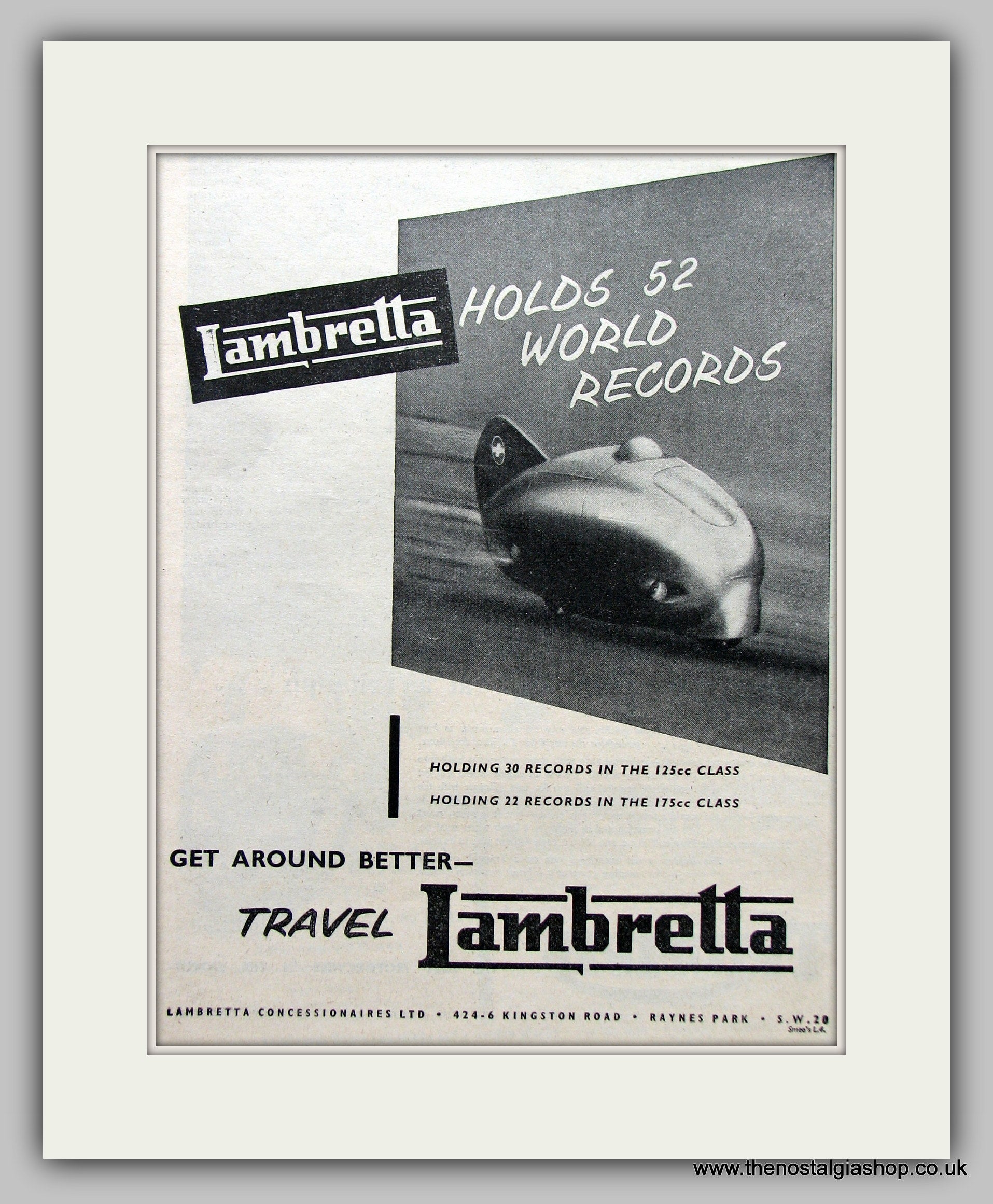 Lambretta Scooter. Holds 52 world records.Vintage Advert. Classic Original Scooter Advert 1957. Presented in cream bevel cut mount with backing card and clear bag. Ready to fit in 14 x 11 inch frame. Want it framing? If so, buy this then go to Frames Available Category. Click to buy on the suitable frame and we will do the rest. All our adverts, unless clearly stated are Originals from the date shown They make excellent pieces of wall art and stunning gifts. Many are rare and hard to find and once sold, may not be replaced. Remember you are buying a piece of history. Website watermark is not on original.