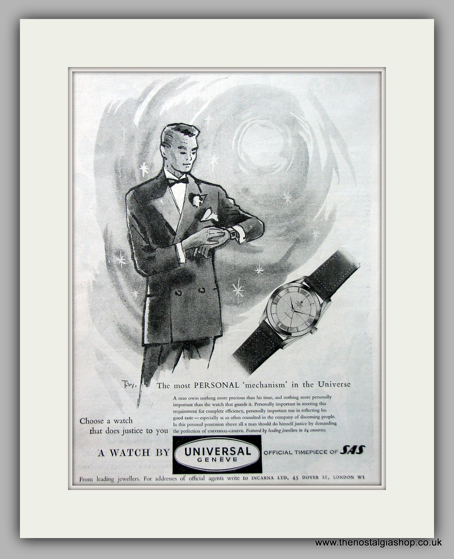 Universal Geneve watches. The most personal mechanism in the universe. Vintage Advert. Classic original advert 1955. Presented in cream bevel cut mount with backing card and clear bag. Ready to fit in 14 x 11 inch frame. Want it framing? If so, buy this then go to Frames Available Category. Click to buy on the suitable frame and we will do the rest. All our adverts, unless clearly stated are Originals from the date shown. They make excellent pieces of wall art and stunning gifts. Many are rare and hard to find and once sold, may not be replaced. Remember you are buying a piece of history. Website watermark is not on original.