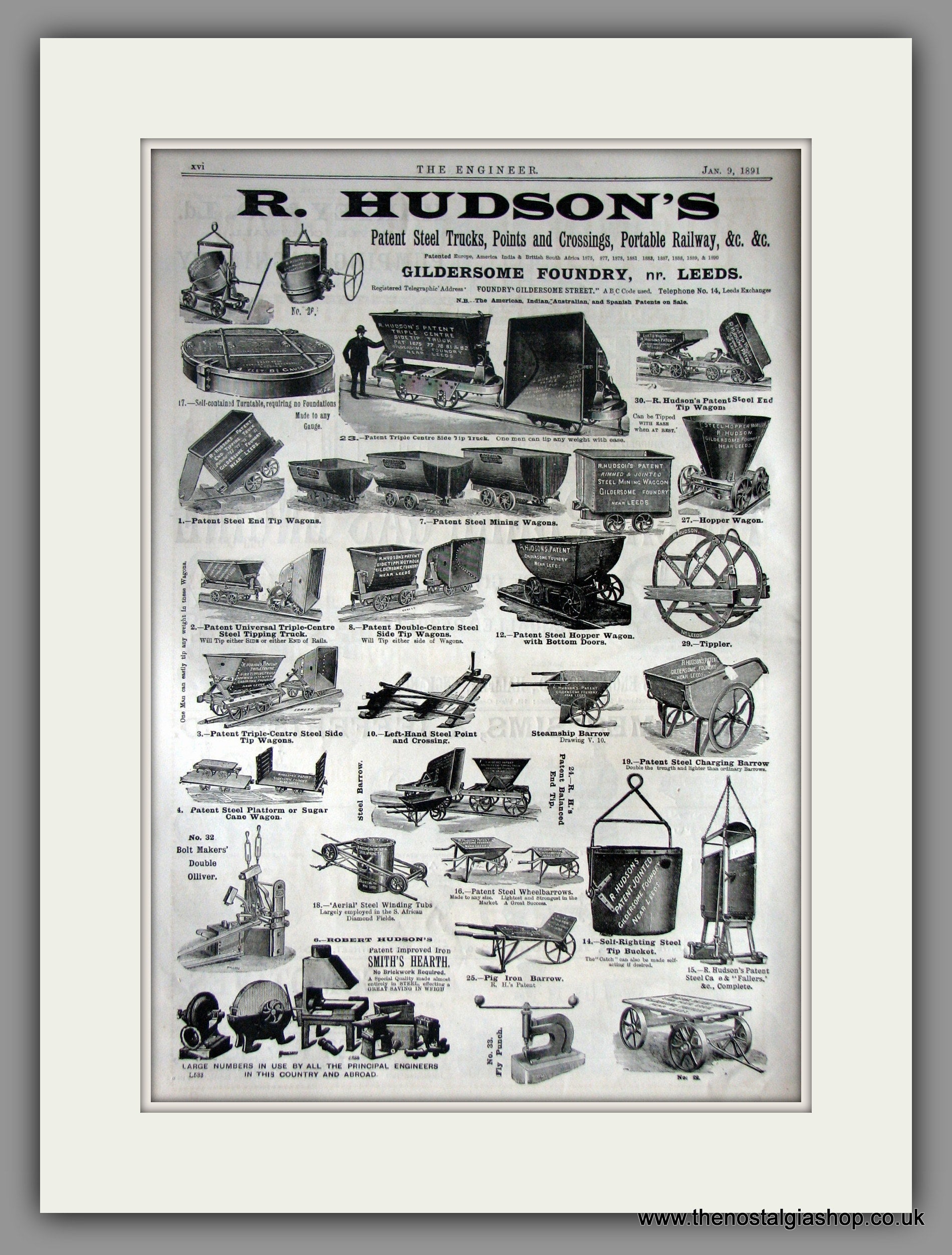 R. Hudsons Patents. Gildersome Foundry, Leeds. Mining Equipment. This is a large Original advert 1891. Yes Over 120 Years old and in superb condition. Ultra Rare. The nature of the printing and paper used back in the day means there is sometimes a hint of bleed through from the reverse side, usually hard to notice but we mention it anyway. Presented in cream bevel cut mount with backing card and clear bag. Ready to fit in 20 x 16 inch frame. The mounted advert will be posted via courier and well packed - protected with a sheet of hardboard to keep it rigid. Any questions or inquiries, please get in touch, we are here to help! All our adverts, unless clearly stated are Originals from the date shown. They make excellent pieces of wall art and stunning gifts. Many are rare and hard to find and once sold, may not be replaced. Remember you are buying a piece of history. Website watermark is not on original.