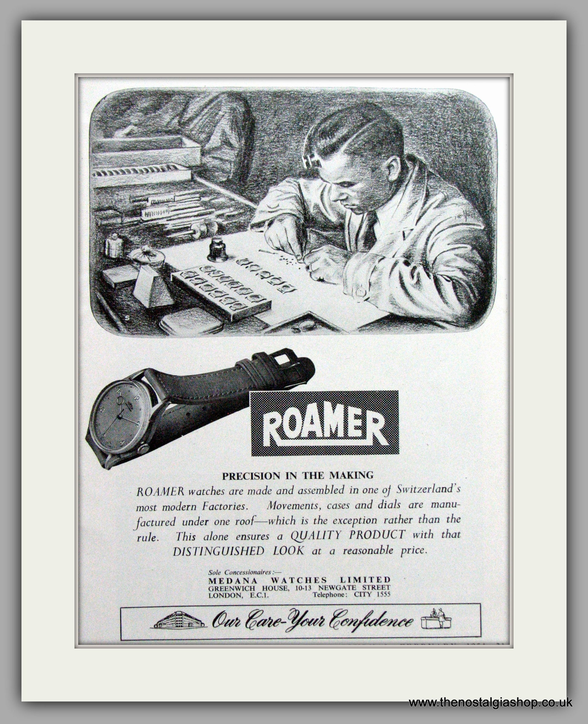Roamer Watches. Precision in the making. Vintage Advert. Classic original advert 1954. Presented in cream bevel cut mount with backing card and clear bag. Ready to fit in 14 x 11 inch frame. Want it framing? If so, buy this then go to Frames Available Category. Click to buy on the suitable frame and we will do the rest. All our adverts, unless clearly stated are Originals from the date shown. They make excellent pieces of wall art and stunning gifts. Many are rare and hard to find and once sold, may not be replaced. Remember you are buying a piece of history. Website watermark is not on original.