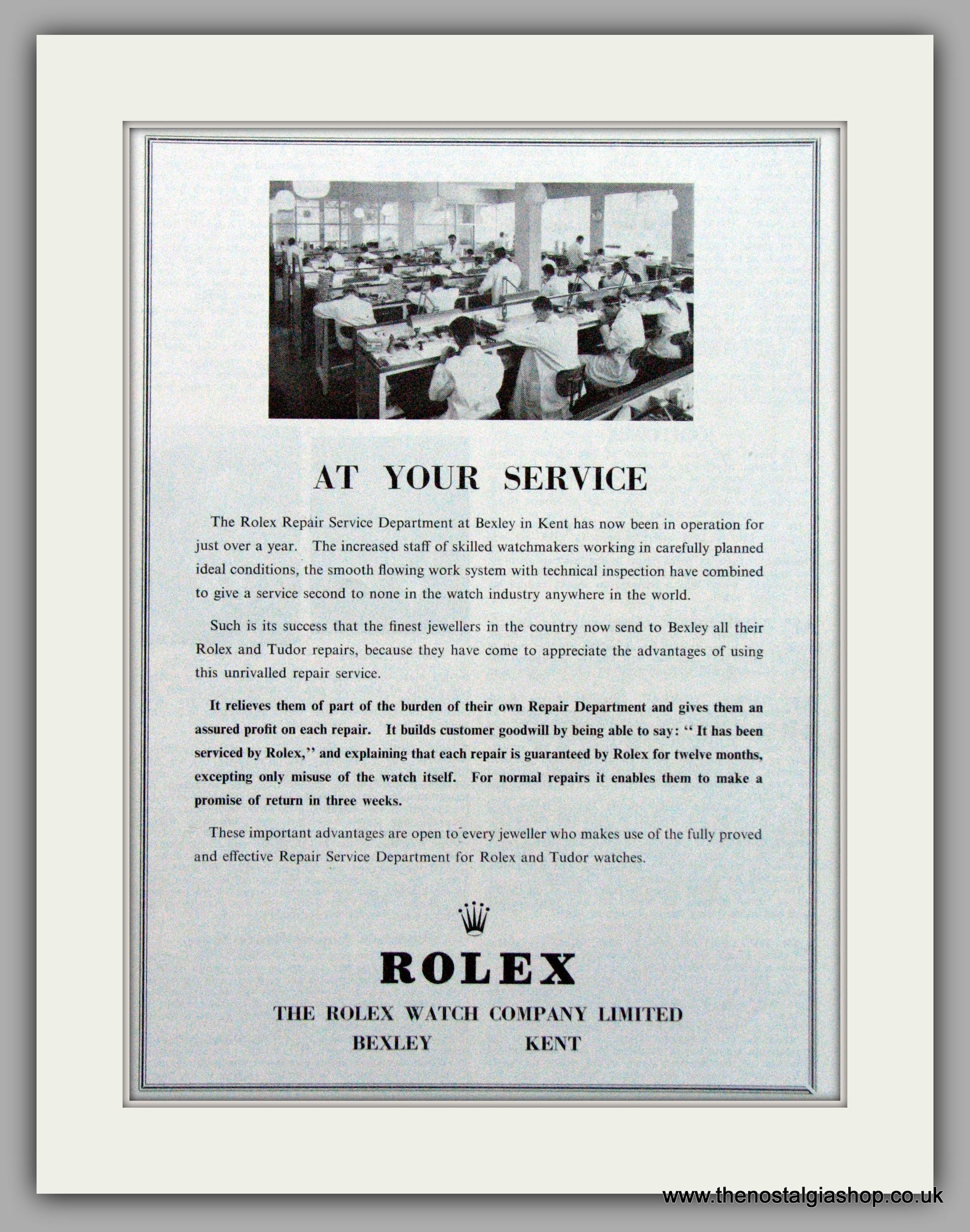 Rolex watch. At your service. Vintage Advert. Classic original advert 1961. Presented in cream bevel cut mount with backing card and clear bag. Ready to fit in 14 x 11 inch frame. Want it framing? If so, buy this then go to Frames Available Category. Click to buy on the suitable frame and we will do the rest. All our adverts, unless clearly stated are Originals from the date shown. They make excellent pieces of wall art and stunning gifts. Many are rare and hard to find and once sold, may not be replaced. Remember you are buying a piece of history. Website watermark is not on original.