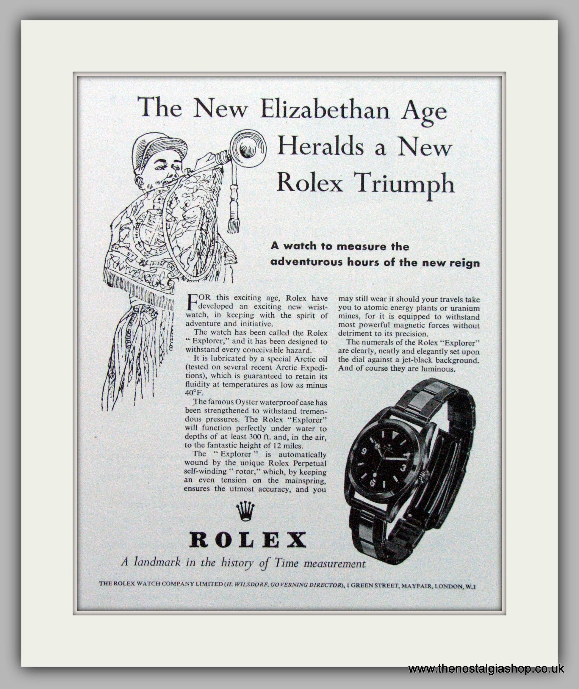 Rolex Watch. The new Elizabethan age heralds a new Rolex triumph. Vintage Advert. Classic original advert 1953. Presented in cream bevel cut mount with backing card and clear bag. Ready to fit in 14 x 11 inch frame. Want it framing? If so, buy this then go to Frames Available Category. Click to buy on the suitable frame and we will do the rest. All our adverts, unless clearly stated are Originals from the date shown. They make excellent pieces of wall art and stunning gifts. Many are rare and hard to find and once sold, may not be replaced. Remember you are buying a piece of history. Website watermark is not on original.