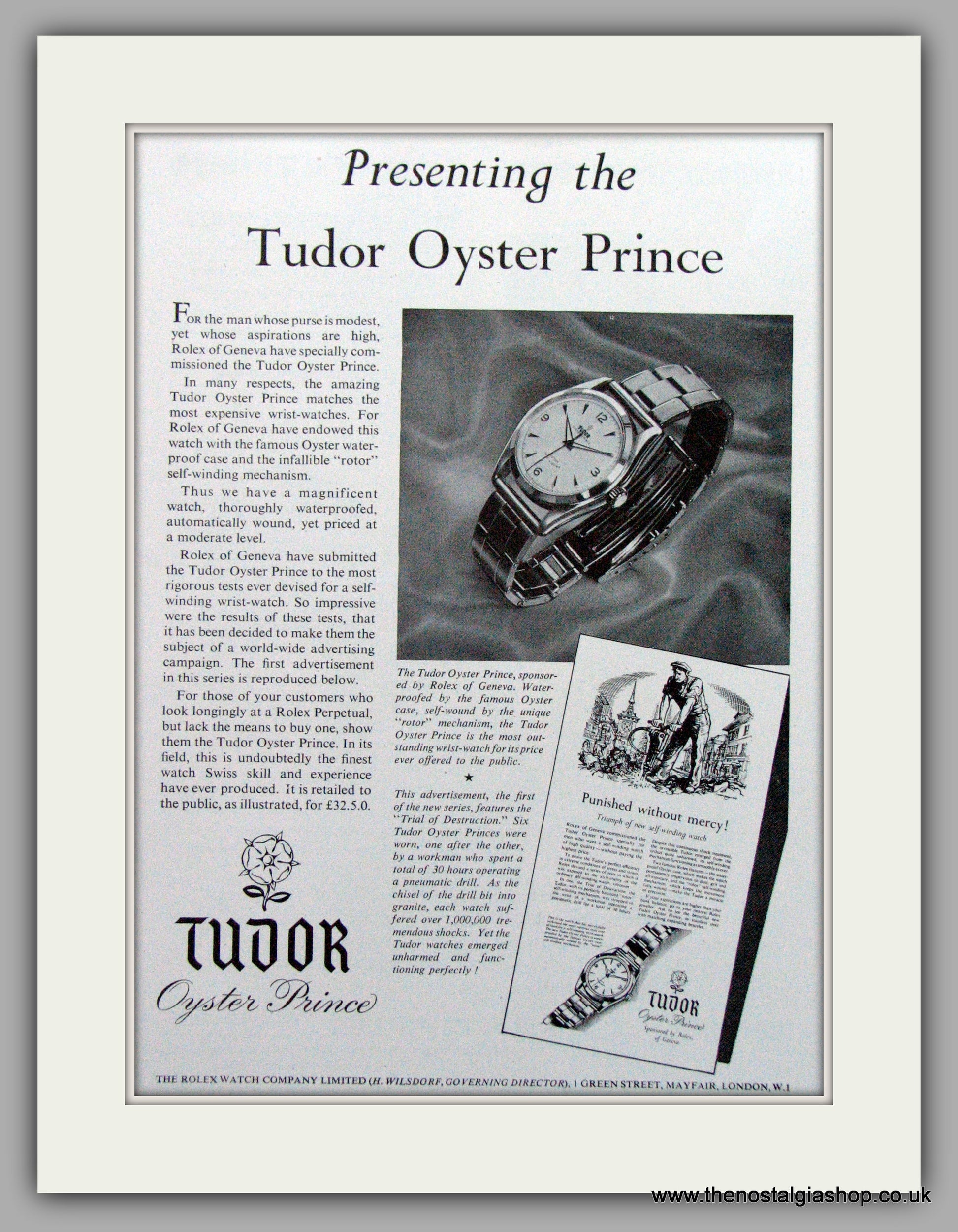 Tudor Oyster Prince watches. Presenting the Tudor Oyster Prince . Vintage Advert. Classic original advert 1954. Presented in cream bevel cut mount with backing card and clear bag. Ready to fit in 14 x 11 inch frame. Want it framing? If so, buy this then go to Frames Available Category. Click to buy on the suitable frame and we will do the rest. All our adverts, unless clearly stated are Originals from the date shown. They make excellent pieces of wall art and stunning gifts. Many are rare and hard to find and once sold, may not be replaced. Remember you are buying a piece of history. Website watermark is not on original.