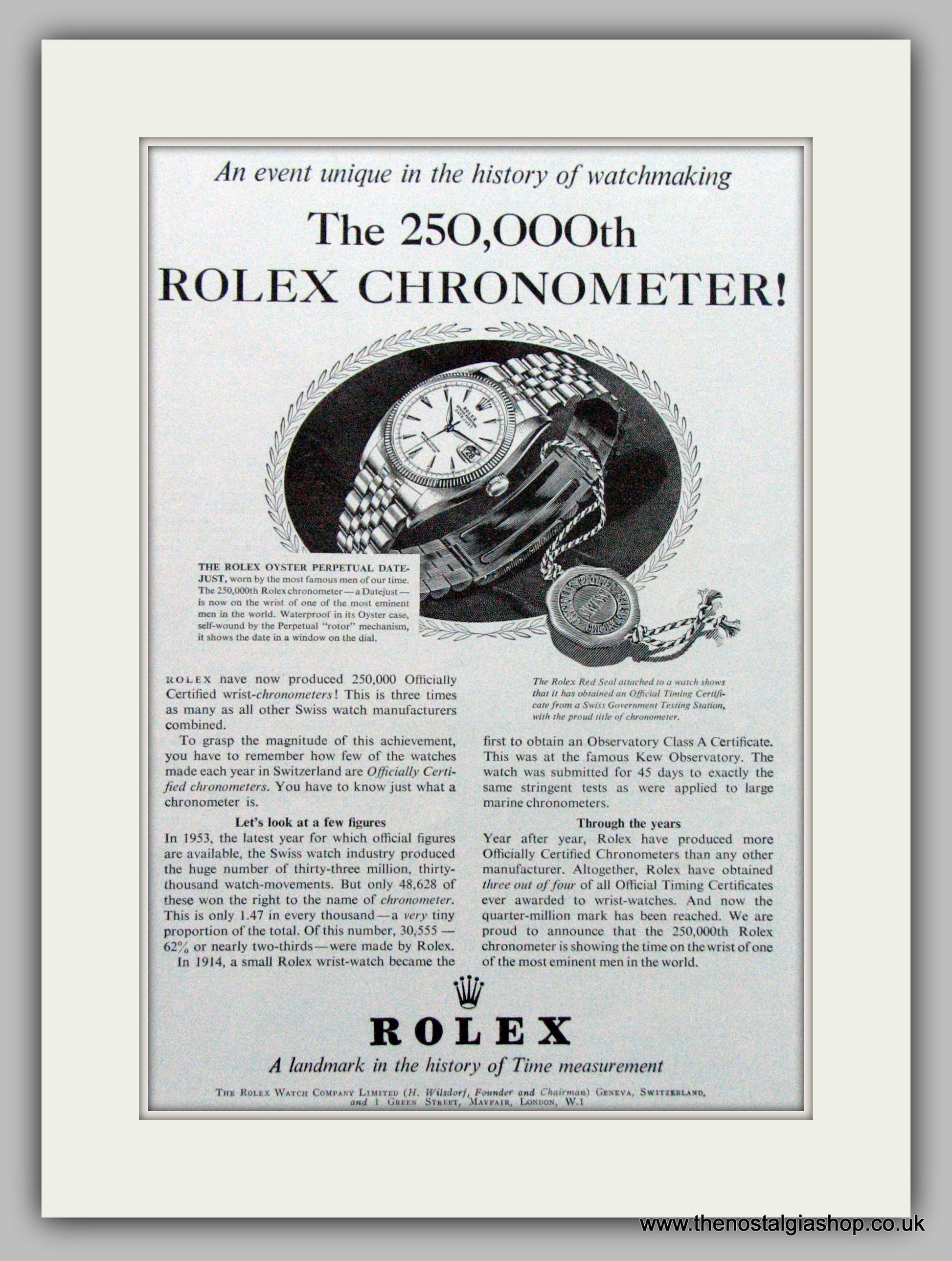 Rolex Chronometer watch. The 250,000th Rolex Chronometer. Vintage Advert. Classic original advert 1956. Presented in cream bevel cut mount with backing card and clear bag. Ready to fit in 14 x 11 inch frame. Want it framing? If so, buy this then go to Frames Available Category. Click to buy on the suitable frame and we will do the rest. All our adverts, unless clearly stated are Originals from the date shown. They make excellent pieces of wall art and stunning gifts. Many are rare and hard to find and once sold, may not be replaced. Remember you are buying a piece of history. Website watermark is not on original.
