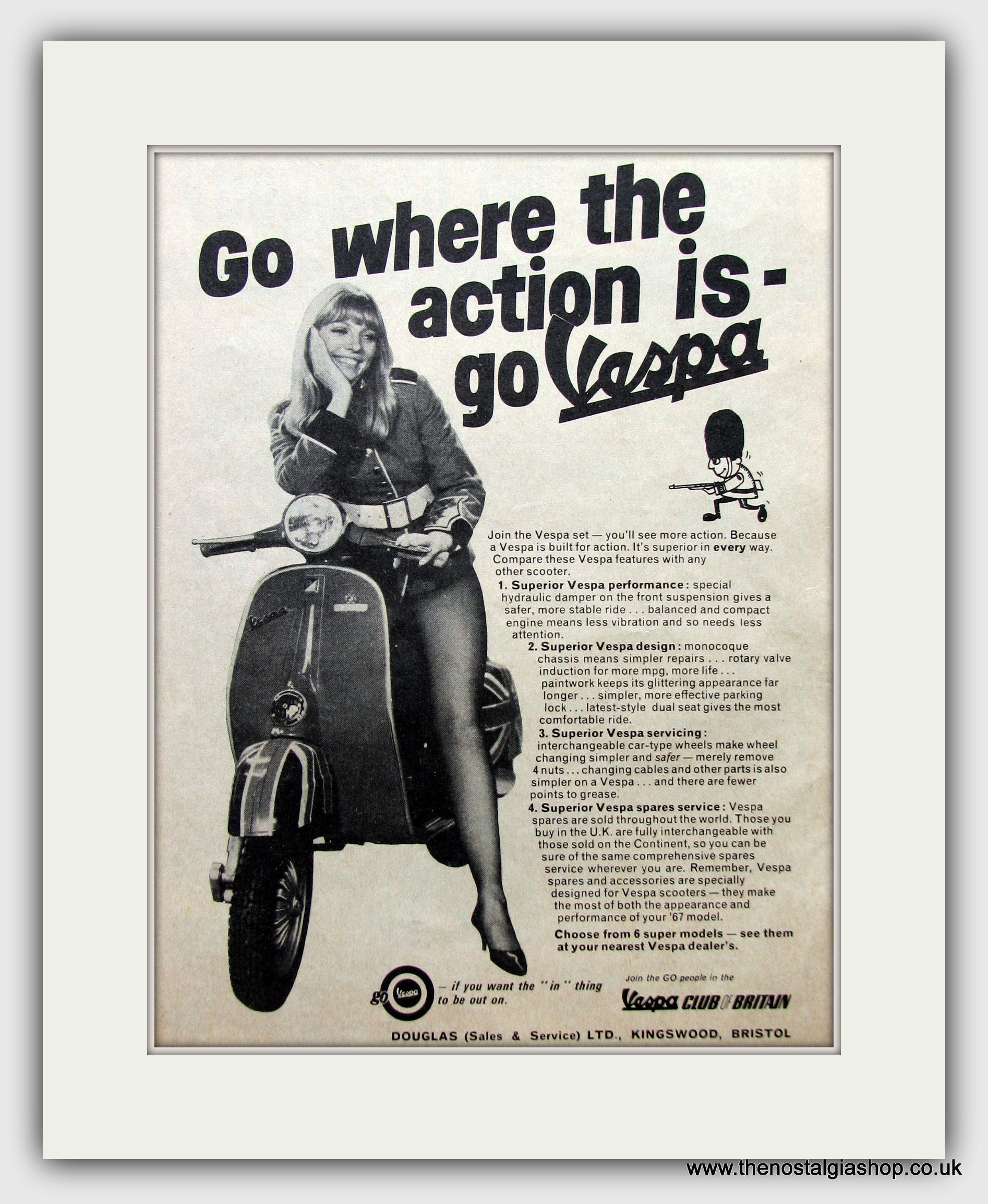 Vespa Go where the action is, Go Vespa!!. Vintage Advert. Classic original Scooter Advert 1967. Presented in cream bevel cut mount with backing card and clear bag. Ready to fit in 14 x 11 inch frame. Want it framing? If so, buy this then go to Frames Available Category. Click to buy on the suitable frame and we will do the rest. All our adverts, unless clearly stated are Originals from the date shown They make excellent pieces of wall art and stunning gifts. Many are rare and hard to find and once sold, may not be replaced. Remember you are buying a piece of history. Website watermark is not on original.
