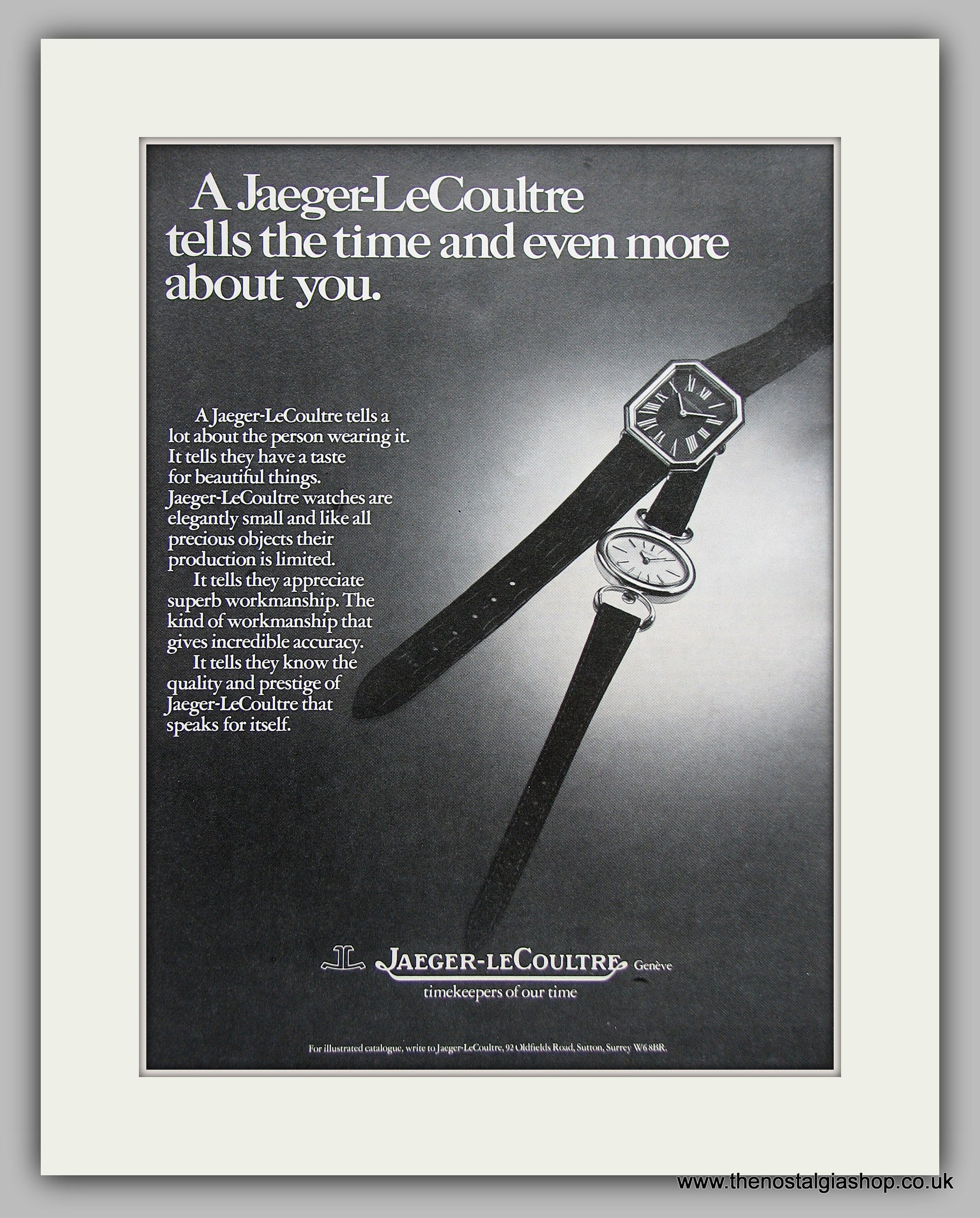Jaeger-Le-Coultre watches. Vintage Advert. A Jaeger-Le Coultre tells the time and even more about you. Classic original advert 1973. Presented in cream bevel cut mount with backing card and clear bag. Ready to fit in 14 x 11 inch frame. Want it framing? If so, buy this then go to Frames Available Category. Click to buy on the suitable frame and we will do the rest. All our adverts, unless clearly stated are Originals from the date shown. They make excellent pieces of wall art and stunning gifts. Many are rare and hard to find and once sold, may not be replaced. Remember you are buying a piece of history. Website watermark is not on original.