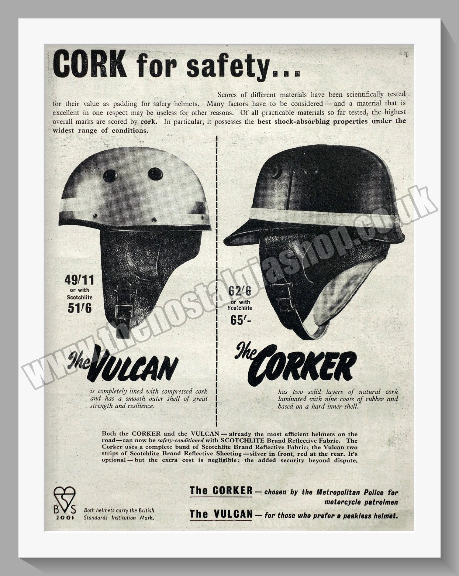 Corker and Vulcan Motor Cycle Helmets. Original Advert 1955. Presented and Supplied in 14 x 11 Inch, cream bevel cut mount with backing card and Clear bag. Ready to frame. All our adverts, unless clearly stated are Originals from the date shown They make excellent pieces of wall art and stunning gifts. Many are rare and hard to find and once sold, may not be replaced. Remember you are buying a piece of history. Website watermark is not on original. Vintage Motorcycle Clothing, Vintage Motorcycle Leathers.