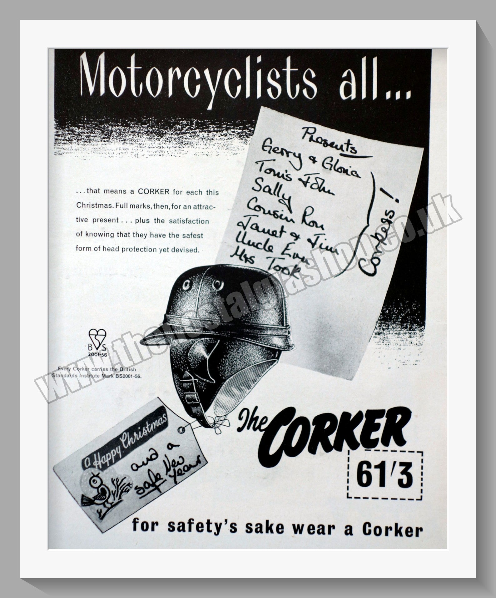Corker Motor Cycle Helmet. Original Advert 1959. Presented and Supplied in 14 x 11 Inch, cream bevel cut mount with backing card and Clear bag. Ready to frame. All our adverts, unless clearly stated are Originals from the date shown They make excellent pieces of wall art and stunning gifts. Many are rare and hard to find and once sold, may not be replaced. Remember you are buying a piece of history. Website watermark is not on original. Vintage Motorcycle Clothing, Vintage Motorcycle Leathers.