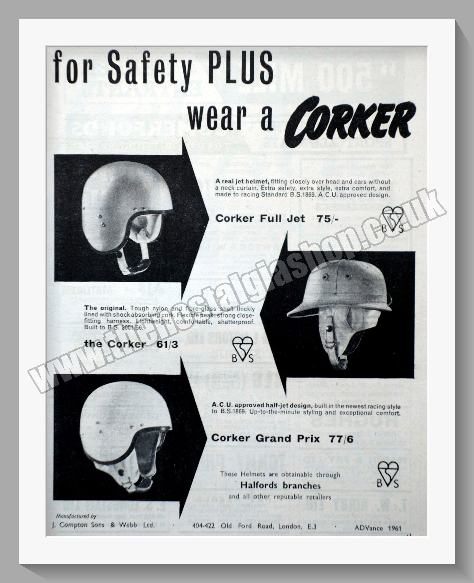 Corker Motor Cycle Helmet. Original Advert 1961. Presented and Supplied in 14 x 11 Inch, cream bevel cut mount with backing card and Clear bag. Ready to frame. All our adverts, unless clearly stated are Originals from the date shown They make excellent pieces of wall art and stunning gifts. Many are rare and hard to find and once sold, may not be replaced. Remember you are buying a piece of history. Website watermark is not on original. Vintage Motorcycle Clothing, Vintage Motorcycle Leathers.