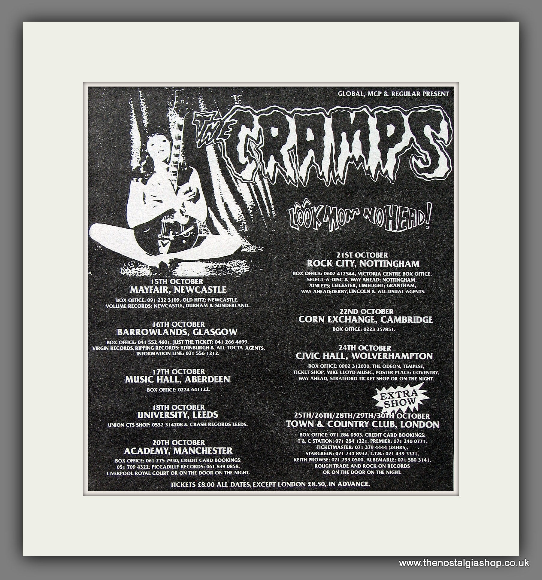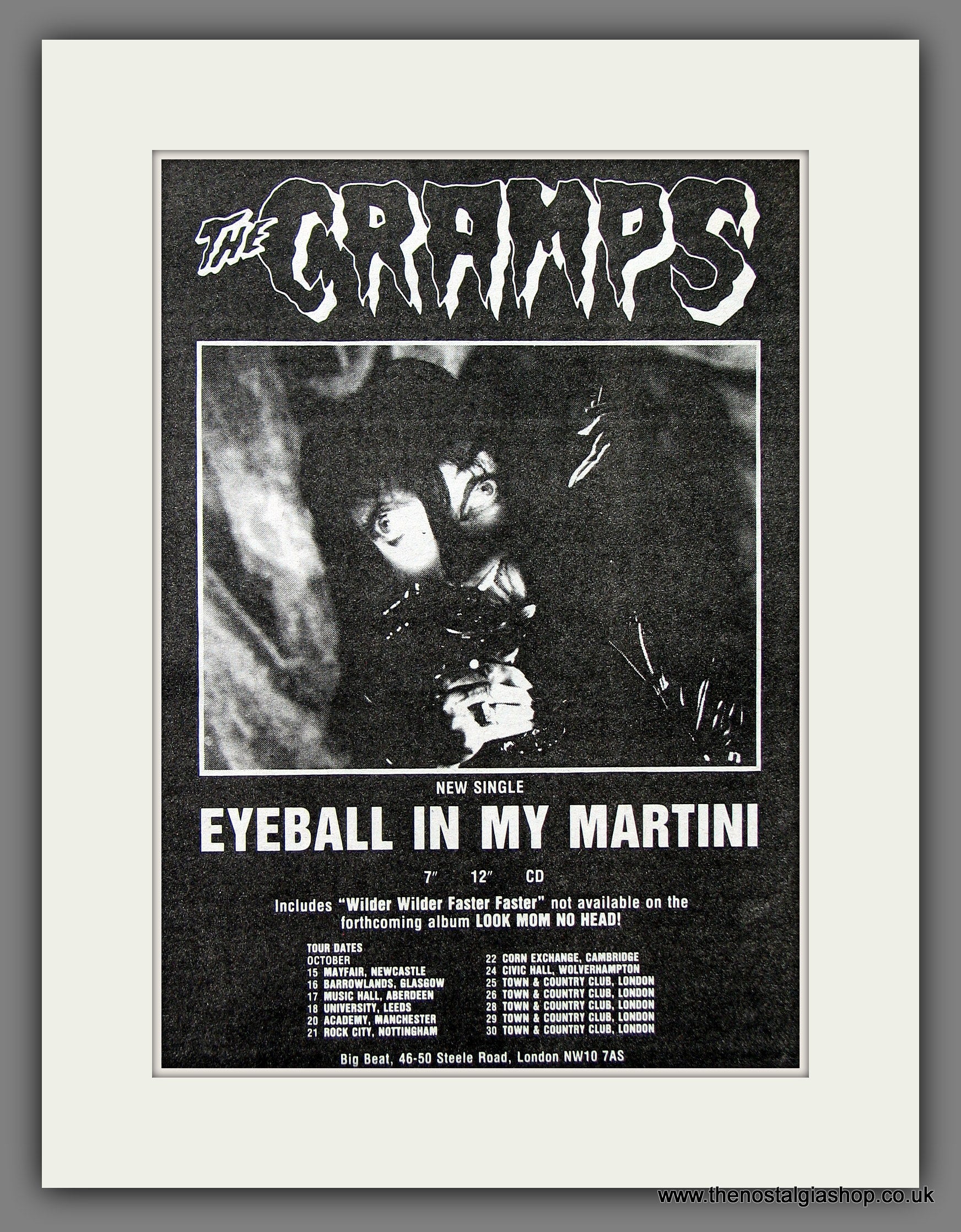 The Cramps. UK Tour. Look Mom No Head. Eyeball In My Martini. 2 x Classic Original adverts 1991. Presented and Supplied in a cream bevel cut mount with backing card and clear bag. Ready to fit in 12 x 10 inch and 10 x 10 Inch frames. All our adverts, unless clearly stated are Originals from the date shown. They make excellent pieces of wall art and stunning gifts. Many are rare and hard to find and once sold, may not be replaced. Remember you are buying a piece of history. Website watermark is not on original.