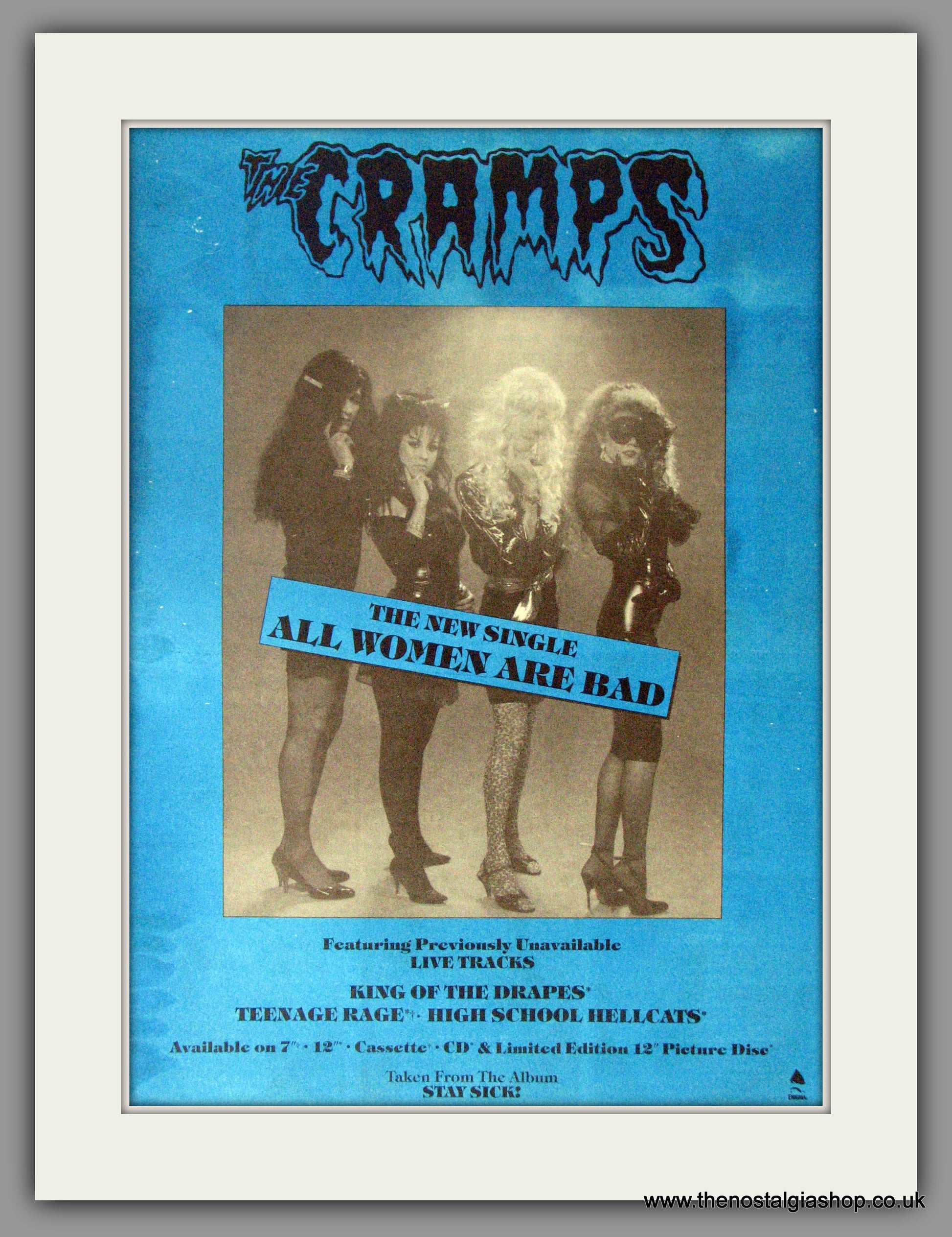 Cramps (The) All Women Are Bad. Vintage Advert 1990 (ref AD11193). Presented and supplied in a cream bevel cut mount with backing card and clear bag. Ready to fit in a 20x16 inch frame. The mounted advert will be posted via courier and well packed - protected with a sheet of hardboard to keep it rigid. Any questions or enquiries, please get in touch, we are here to help! All our adverts, unless clearly stated are originals from the date shown. They make excellent pieces of wall art and stunning gifts. Many are rare and hard to find and once sold, may not be replaced. Remember you are buying a piece of history. Website watermark is not on original.