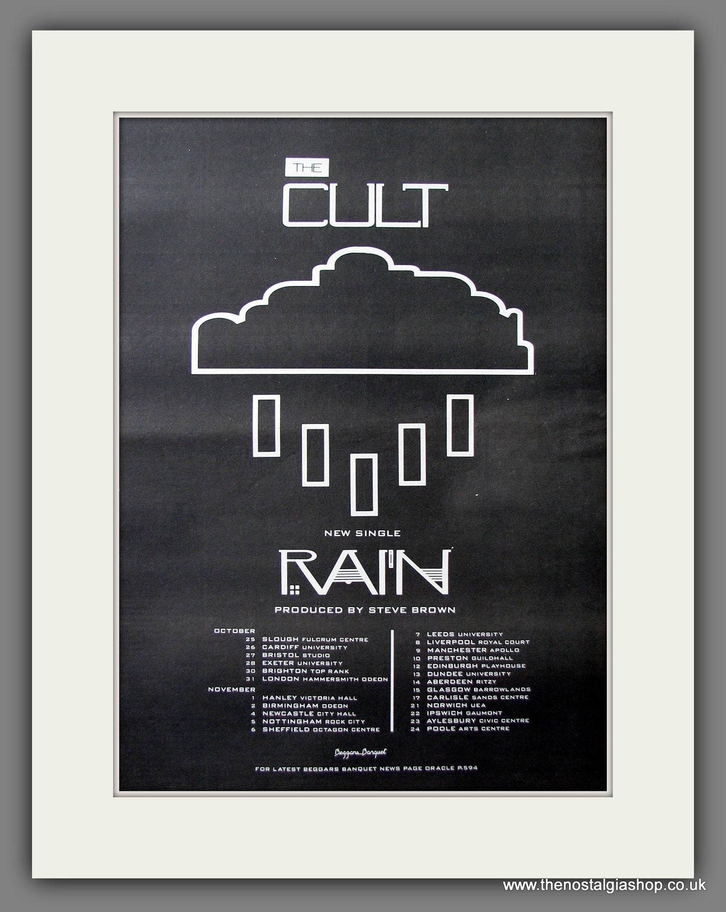 The Cult Rain. This is a large classic Original Vintage Advert 1985. Presented and Supplied in a cream, bevel cut mount with backing card and clear bag. Ready to fit in 20 x 16 inch frame. The mounted advert will be posted via courier and well packed - protected with a sheet of hardboard to keep it rigid. Any questions or inquiries, please get in touch, we are here to help! All our adverts, unless clearly stated are Originals from the date shown. They make excellent pieces of wall art and stunning gifts. Many are rare and hard to find and once sold, may not be replaced. Remember you are buying a piece of history. Website watermark is not on original.