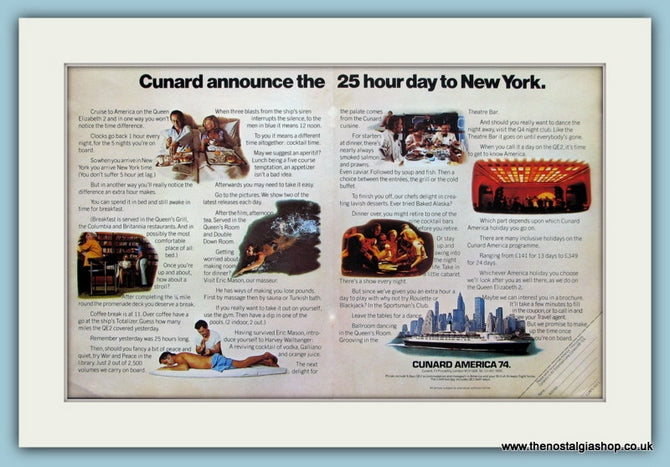 Cunard America Cruise Ship. Cunard announce the 25 hour day to new York.. Classic original advert 1974. These double adverts are unmounted and are A3 size. All our adverts, unless clearly stated are Originals from the date shown. They make excellent pieces of wall art and stunning gifts. Many are rare and hard to find and once sold, may not be replaced. Remember you are buying a piece of history. Website watermark is not on original.