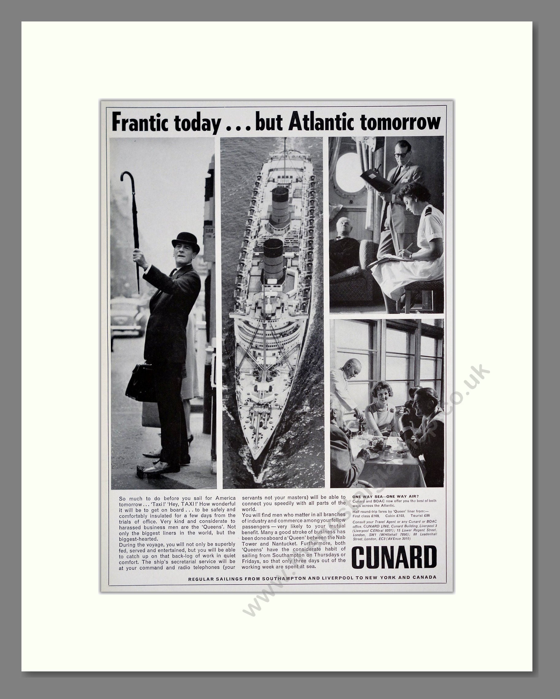 Cunard - Atlantic Tomorrow. Vintage Advert. This is a large classic original advert from 1964. Presented and supplied in a cream bevel cut mount with backing card and clear bag. Ready to fit in a 18 x 14 inches frame. The mounted advert will be posted via courier and well packed - protected with a sheet of hardboard to keep it rigid. Any questions or enquiries, please get in touch, we are here to help! All our adverts, unless clearly stated are originals from the date shown. They make excellent pieces of wall art and stunning gifts. Many are rare and hard to find and once sold, may not be replaced. Remember you are buying a piece of history. Website watermark is not on original.