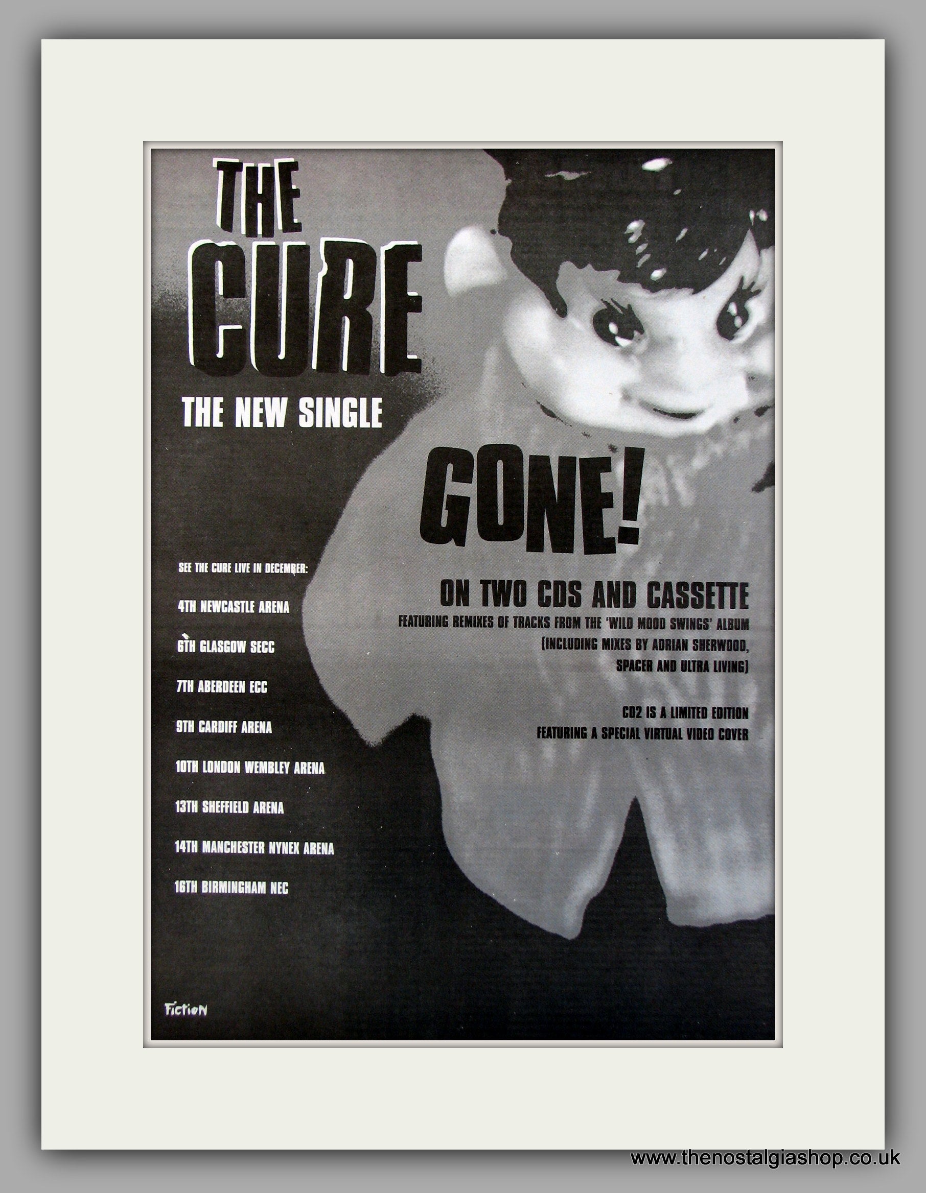 Cure (The) Gone. Also UK Tour Dates. Vintage Advert 1996 (ref AD10114). Presented and supplied in a cream bevel cut mount with backing card and clear bag. Ready to fit in a 20x16 inch frame. The mounted advert will be posted via courier and well packed - protected with a sheet of hardboard to keep it rigid. Any questions or enquiries, please get in touch, we are here to help! All our adverts, unless clearly stated are originals from the date shown. They make excellent pieces of wall art and stunning gifts. Many are rare and hard to find and once sold, may not be replaced. Remember you are buying a piece of history. Website watermark is not on original.