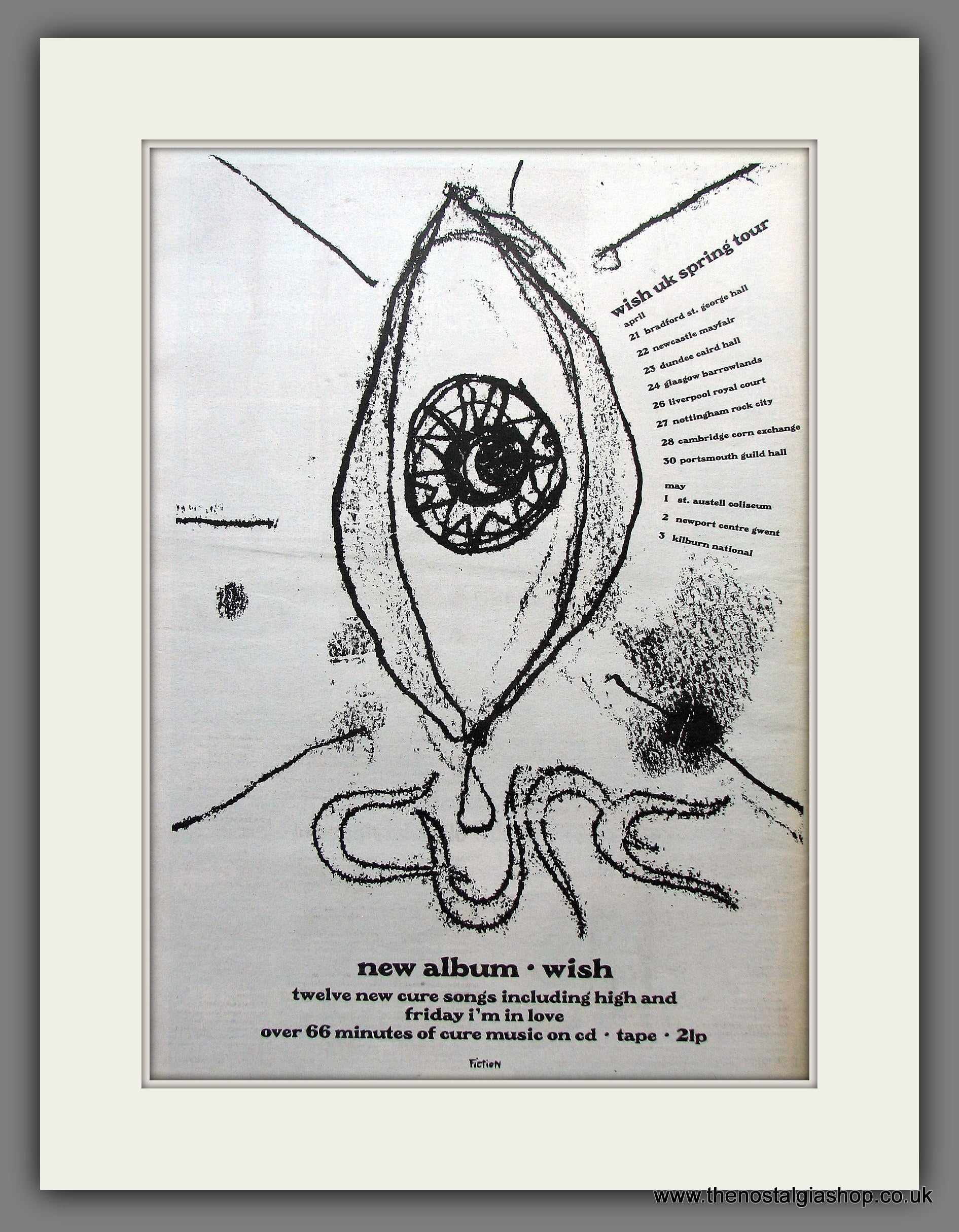 The Cure. Wish. This is a large classic Original advert 1992. Presented in cream bevel cut mount with backing card and clear bag. Ready to fit in 20 x 16 inch frame. The mounted advert will be posted via courier and well packed - protected with a sheet of hardboard to keep it rigid. Any questions or inquiries, please get in touch, we are here to help! All our adverts, unless clearly stated are Originals from the date shown. They make excellent pieces of wall art and stunning gifts. Many are rare and hard to find and once sold, may not be replaced. Remember you are buying a piece of history. Website watermark is not on original.