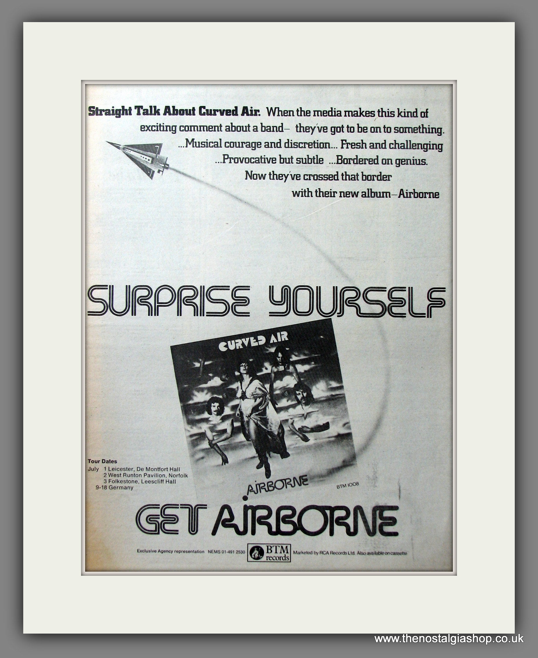 Curved Air. Airborne. Original Advert 1976 (ref AD11523). Presented and supplied in a cream bevel cut mount with backing card and clear bag. Ready to fit in a 20x16 inch frame. The mounted advert will be posted via courier and well packed - protected with a sheet of hardboard to keep it rigid. Any questions or enquiries, please get in touch, we are here to help! All our adverts, unless clearly stated are originals from the date shown. They make excellent pieces of wall art and stunning gifts. Many are rare and hard to find and once sold, may not be replaced. Remember you are buying a piece of history. Website watermark is not on original.