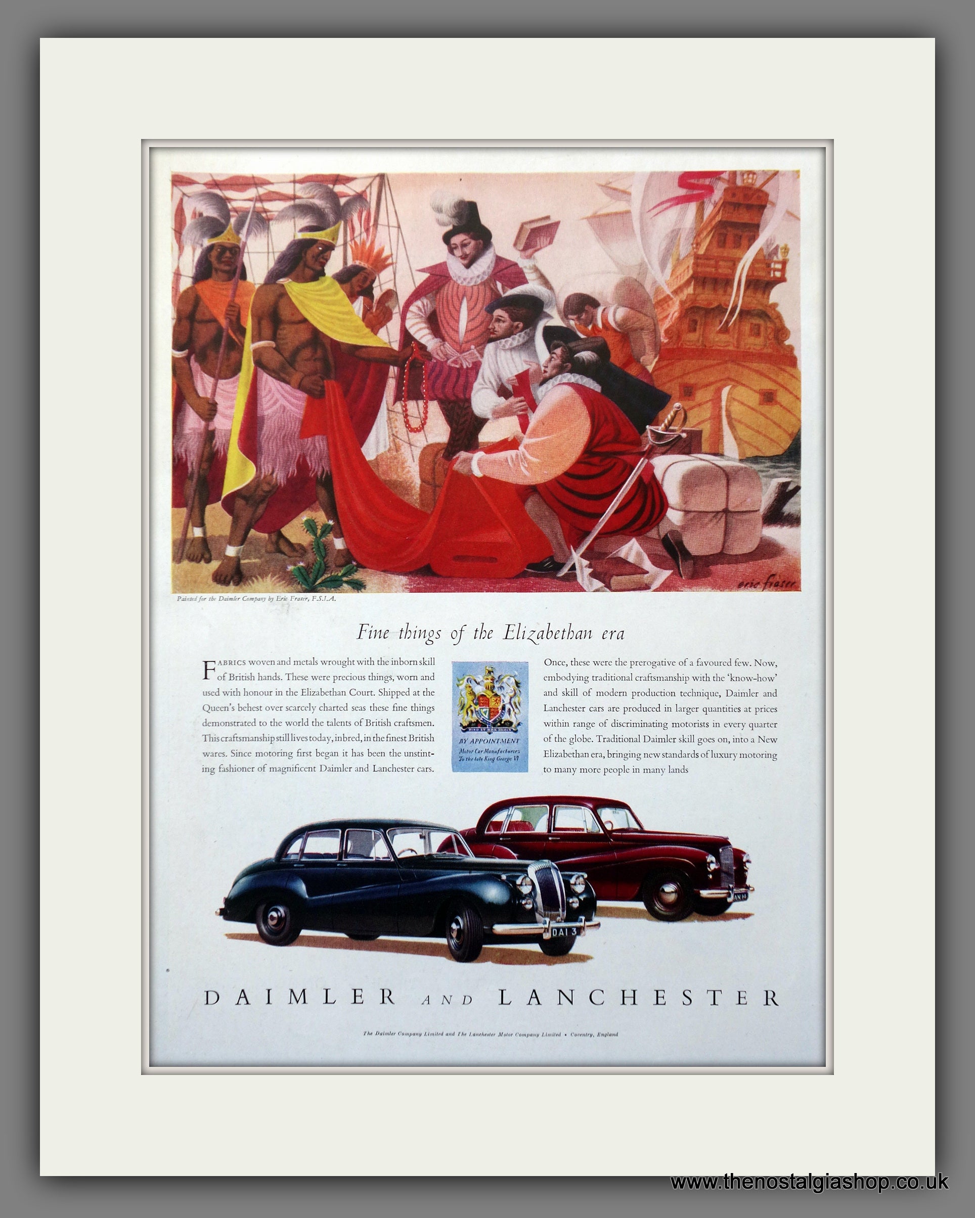 Daimler & Lanchester. Original Vintage Advert 1953. Presented and Supplied in a cream bevel cut mount with backing card and clear bag. Ready to fit in 18 x 14 inch frame. All our adverts, unless clearly stated are Originals from the date shown They make excellent pieces of wall art and stunning gifts. Many are rare and hard to find and once sold, may not be replaced. Remember you are buying a piece of history. Website watermark is not on original.