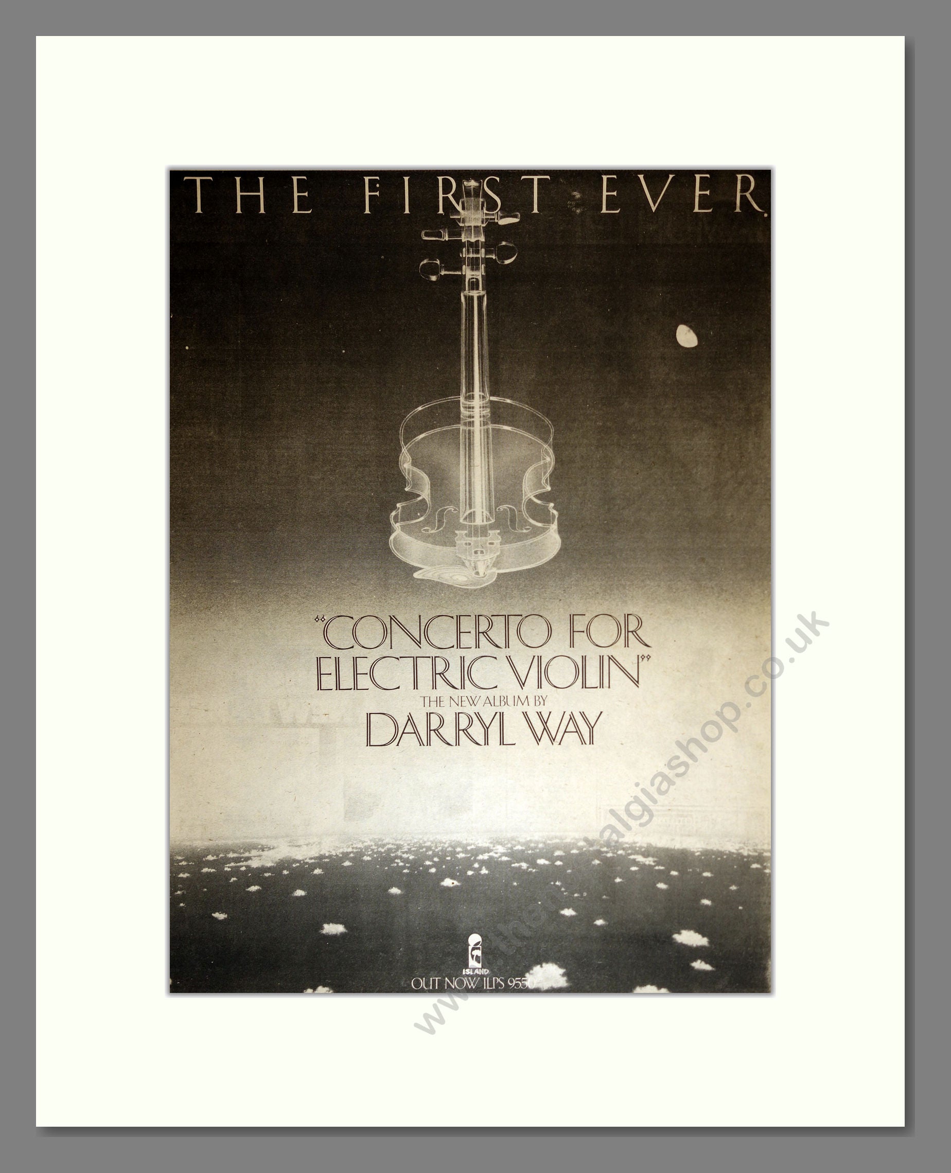 Darryl Way - Concerto For Electric Violin. Vintage Advert. This is a large classic original advert from 1979. Presented and supplied in a cream bevel cut mount with backing card and clear bag. Ready to fit in a 20x16 inch frame. The mounted advert will be posted via courier and well packed - protected with a sheet of hardboard to keep it rigid. Any questions or enquiries, please get in touch, we are here to help! All our adverts, unless clearly stated are originals from the date shown. They make excellent pieces of wall art and stunning gifts. Many are rare and hard to find and once sold, may not be replaced. Remember you are buying a piece of history. Website watermark is not on original.