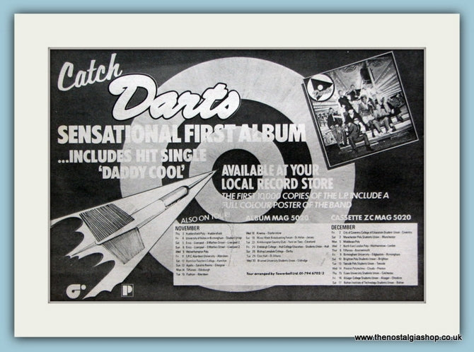 Darts 'Daddy Cool'. Nov/Dec Tour dates. Classic original advert 1977. Presented in cream bevel cut mount with backing card. Ready to fit in 14 x 11 inch frame. Want it framing? If so, buy this then go to Frames Available Category. Click to buy on the suitable frame and we will do the rest. All our adverts, unless clearly stated are Originals from the date shown. They make excellent pieces of wall art and stunning gifts. Many are rare and hard to find and once sold, may not be replaced. Remember you are buying a piece of history. Website watermark is not on original.