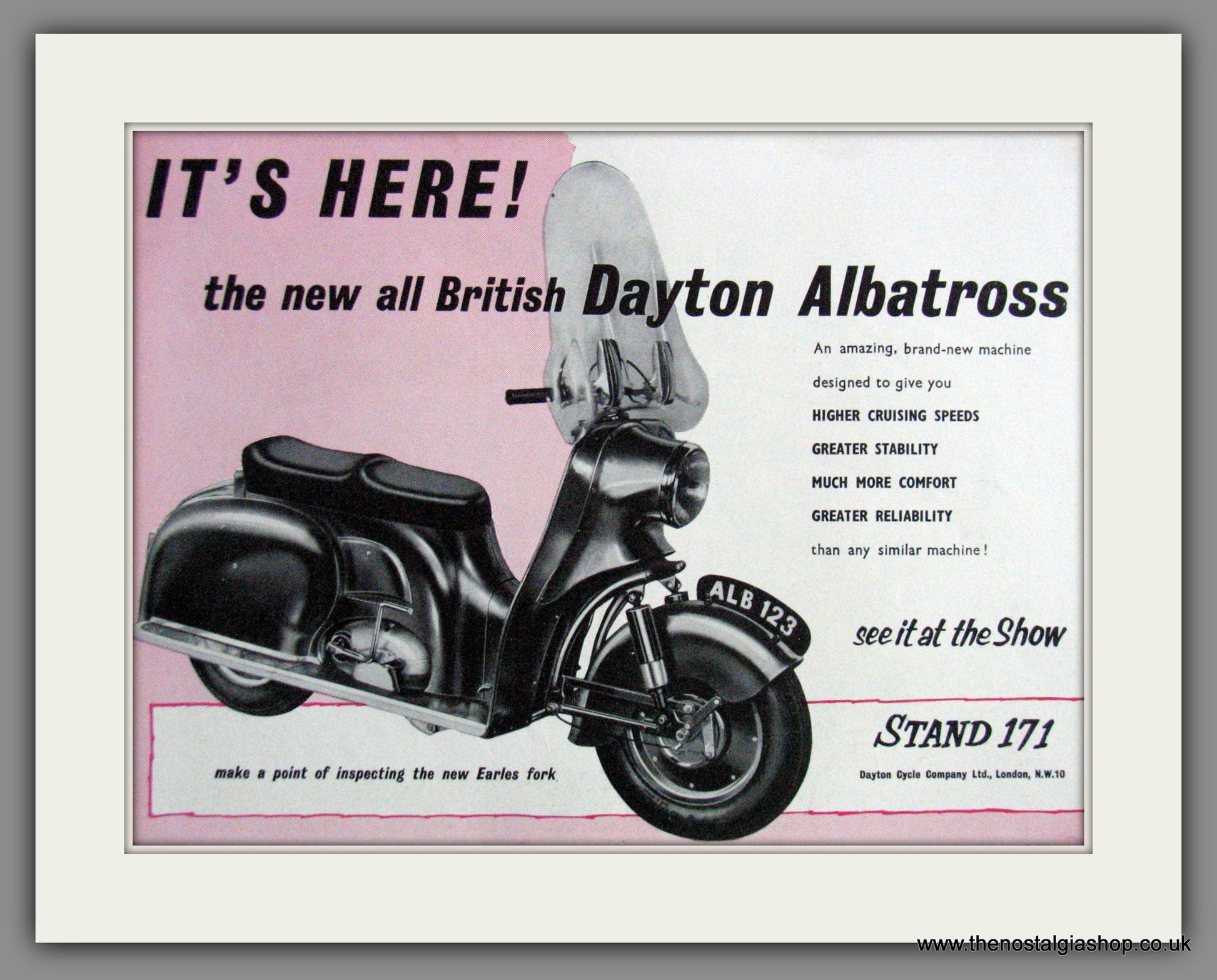 Dayton Albatross British Scooter. Vintage Original Advert from 1954. Presented and Supplied in cream bevel cut mount with backing board and clear bag. Made to fit straight into 14 by 11 inch frame. (Available in separate category if required) All our Adverts, unless clearly stated are Original and from the year shown. They are NOT modern reprints. Many are difficult to get hold of , some are very rare and once sold may not be replaced, Remember, you are buying a piece of historic nostalgia. Lots more adverts available. Please contact us if you don't see the advert you want. Scooters. Mods.