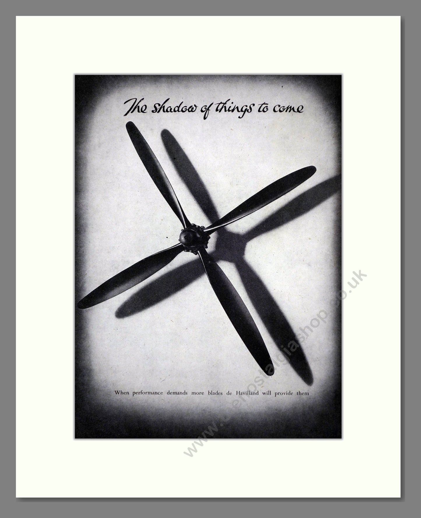 De Havilland - Propellers. Vintage Advert. This is a classic original advert from 1942. Presented and supplied in a cream bevel cut mount with backing card and clear bag. Ready to fit in a 14 x 11 inches frame. The mounted advert will be posted via courier and well packed - protected with a sheet of hardboard to keep it rigid. Any questions or enquiries, please get in touch, we are here to help! All our adverts, unless clearly stated are originals from the date shown. They make excellent pieces of wall art and stunning gifts. Many are rare and hard to find and once sold, may not be replaced. Remember you are buying a piece of history. Website watermark is not on original.