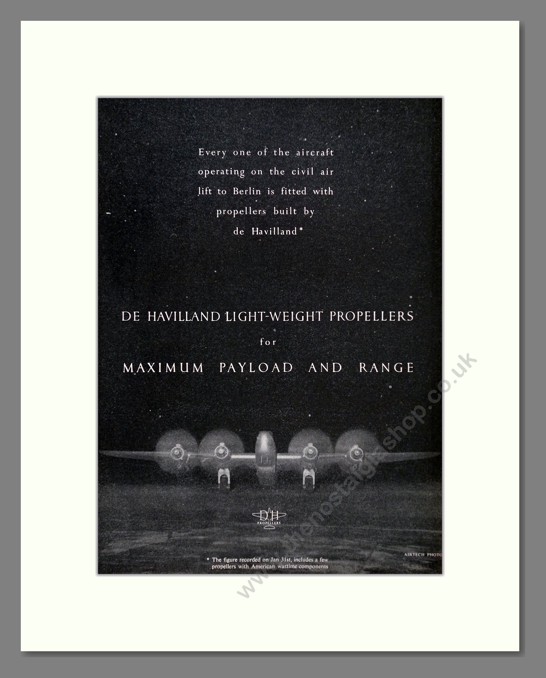De Havilland - Propellers. Vintage Advert. This is a classic original advert from 1949. Presented and supplied in a cream bevel cut mount with backing card and clear bag. Ready to fit in a 14 x 11 inches frame. The mounted advert will be posted via courier and well packed - protected with a sheet of hardboard to keep it rigid. Any questions or enquiries, please get in touch, we are here to help! All our adverts, unless clearly stated are originals from the date shown. They make excellent pieces of wall art and stunning gifts. Many are rare and hard to find and once sold, may not be replaced. Remember you are buying a piece of history. Website watermark is not on original.