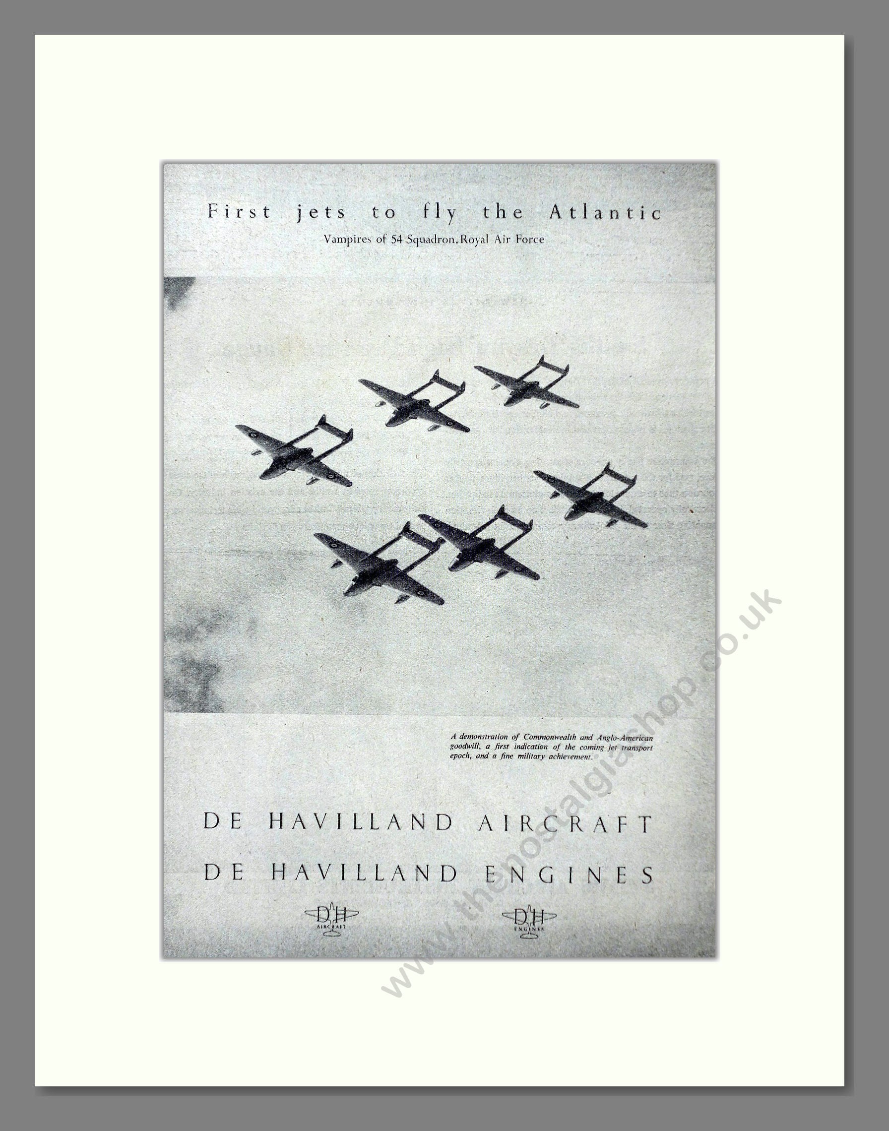 De Havilland - Vampire. Vintage Advert. This is a classic original advert from 1948. Presented and supplied in a cream bevel cut mount with backing card and clear bag. Ready to fit in a 14 x 11 inches frame. The mounted advert will be posted via courier and well packed - protected with a sheet of hardboard to keep it rigid. Any questions or enquiries, please get in touch, we are here to help! All our adverts, unless clearly stated are originals from the date shown. They make excellent pieces of wall art and stunning gifts. Many are rare and hard to find and once sold, may not be replaced. Remember you are buying a piece of history. Website watermark is not on original.