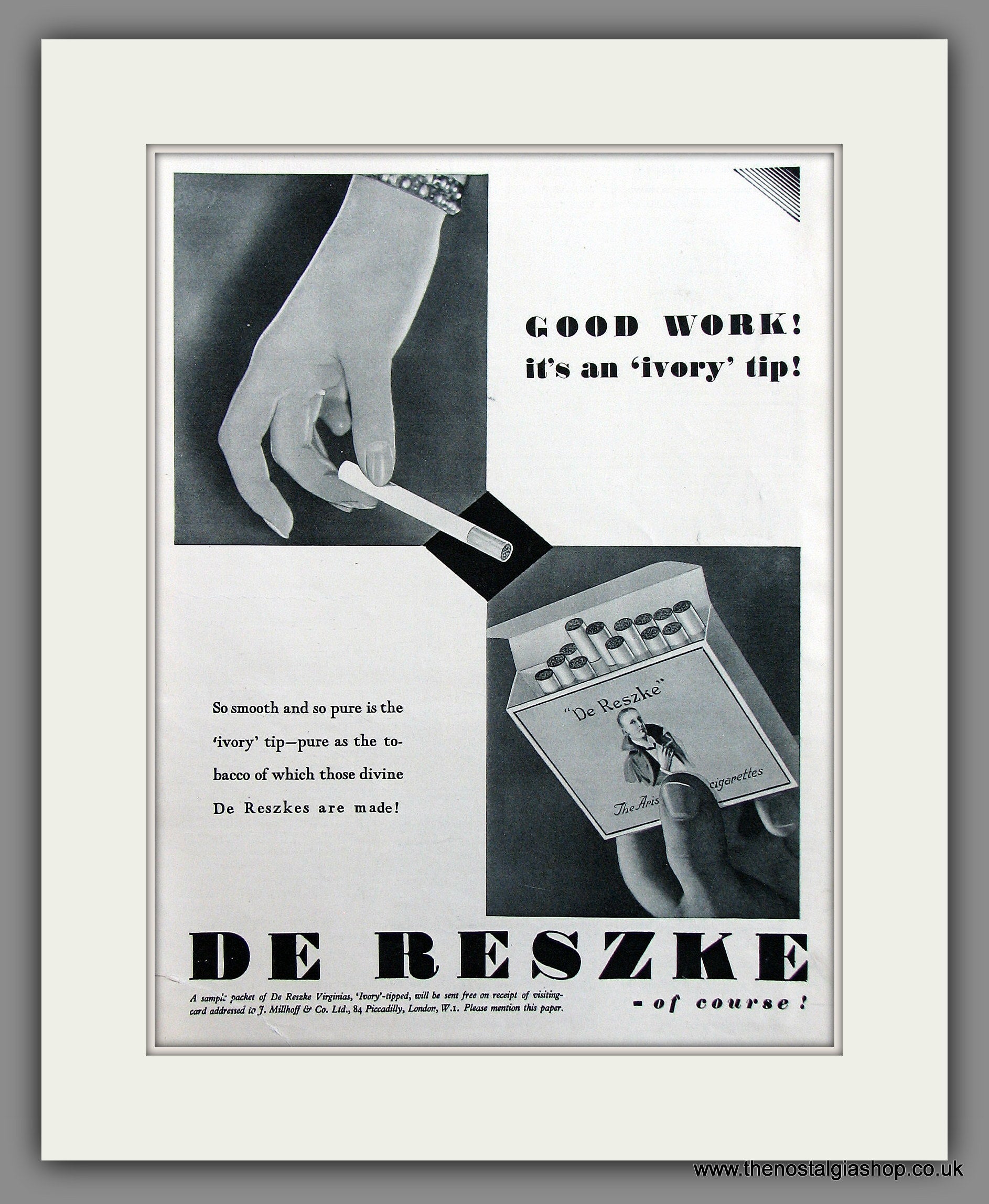 De Reszke Cigarettes. Original Vintage Advert 1930. Presented and Supplied in a 18 x 14 Inch cream mount with backing board and clear bag. Ready for Framing. All our adverts, unless clearly stated are Originals from the date shown. They make excellent pieces of wall art and stunning gifts. Many are rare and hard to find and once sold, may not be replaced. Remember you are buying a piece of history. Website watermarks are not on original. Adverts will be well packed with hardboard to keep rigid in the post.