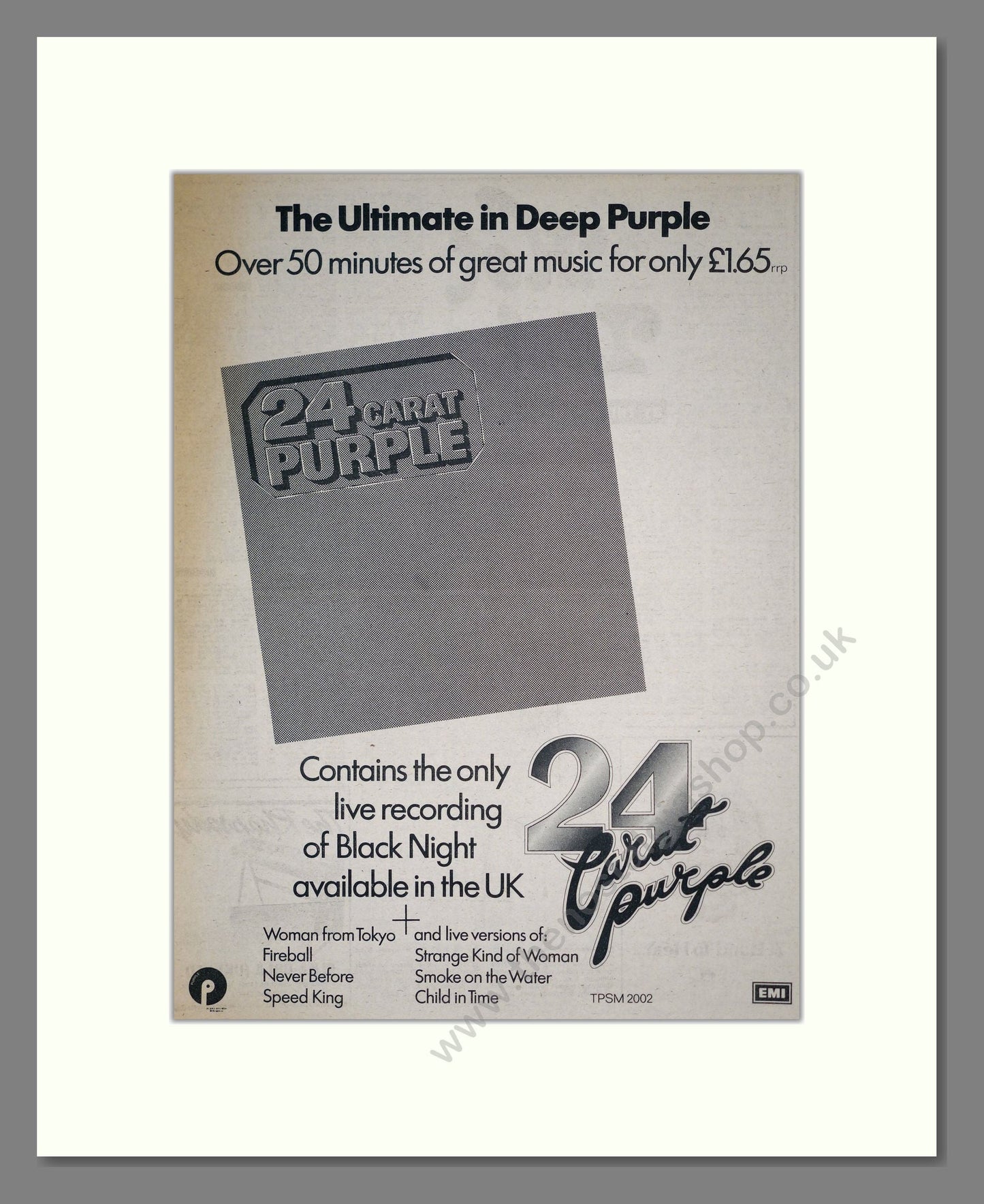 Deep Purple - 24 Carat Purple. Vintage Advert. This is a large classic original advert from 1975. Presented and supplied in a cream bevel cut mount with backing card and clear bag. Ready to fit in a 20 x 16 inches frame. The mounted advert will be posted via courier and well packed - protected with a sheet of hardboard to keep it rigid. Any questions or enquiries, please get in touch, we are here to help! All our adverts, unless clearly stated are originals from the date shown. They make excellent pieces of wall art and stunning gifts. Many are rare and hard to find and once sold, may not be replaced. Remember you are buying a piece of history. Website watermark is not on original.