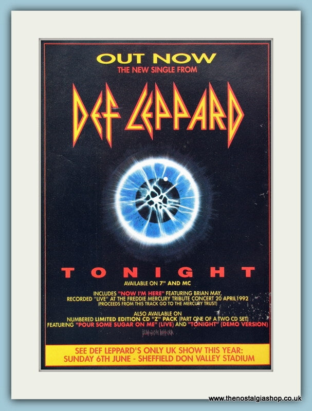 Def Leppard. Tonight .Classic original advert 1993. Presented in cream bevel cut mount with backing card and clear bag. Ready to fit in 14 x 11 inch frame. Want it framing? If so, buy this then go to Frames Available Category. Click to buy on the suitable frame and we will do the rest. All our adverts, unless clearly stated are Originals from the date shown They make excellent pieces of wall art and stunning gifts. Many are rare and hard to find and once sold, may not be replaced. Remember you are buying a piece of history. Website watermark is not on original.