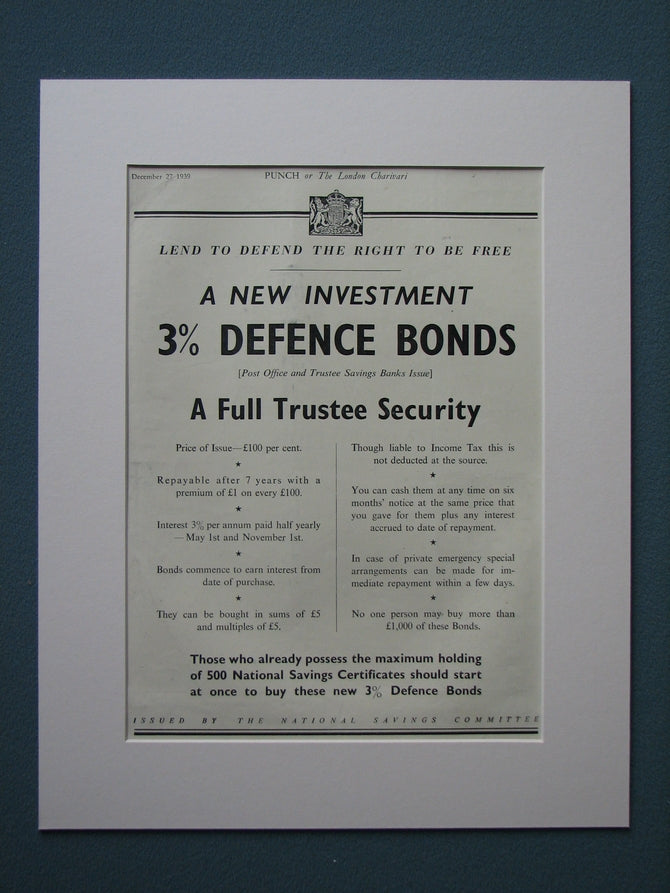 Defence Bonds Lend to defend the right to be free. Classic original advert 1939. Professionally sealed and presented in cream bevel cut mount with backing card. Ready to fit in 14 x 11 inch frame. Want it framing? buy this then go to Frames Available Catagory. Click to buy on the suitable frame and we will do the rest. All our adverts, unless clearly stated are Originals from the date shown They make excellent pieces of wall art and stunning gifts. Many are rare and hard to find and once sold, may not be replaced. Remember you are buying a piece of history
