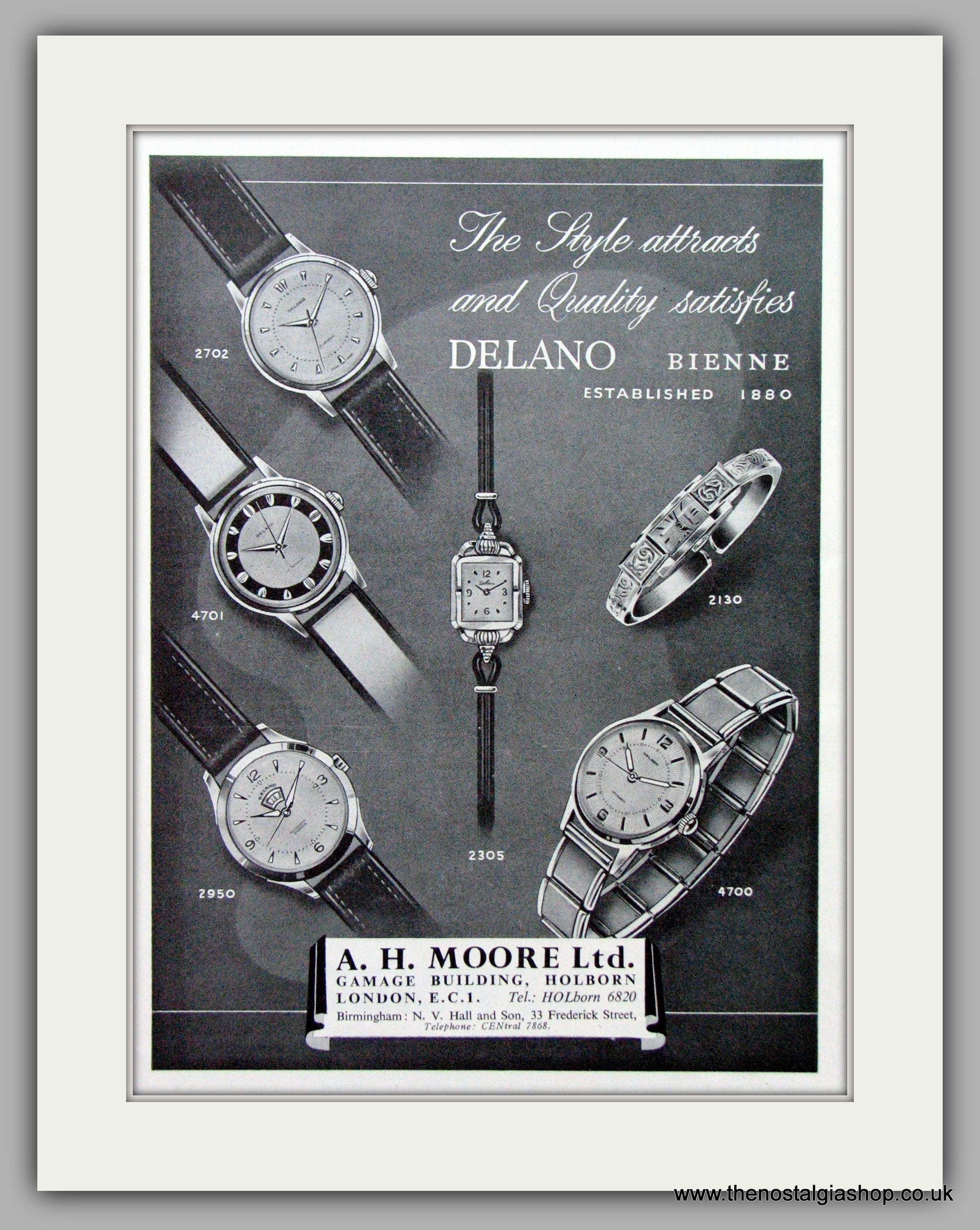 Delano Bienne Watches. A. H. Moore Ltd. Vintage Advert. Original Advert 1956. Presented in cream bevel cut mount with backing card and clear bag. Ready to fit in 14 x 11 inch frame. Want it framing? If so, buy this then go to Frames Available Category. Click to buy on the suitable frame(s) and we will do the rest. All our adverts, unless clearly stated are Originals from the date shown. They make excellent pieces of wall art and stunning gifts. Many are rare and hard to find and once sold, may not be replaced. Remember you are buying a piece of history. Website watermark is not on original.