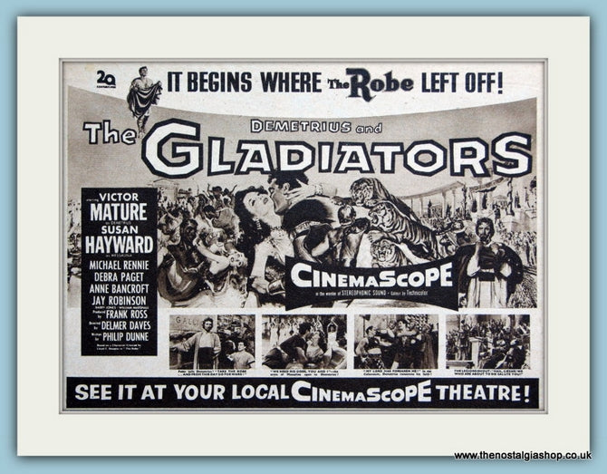 Demetrius And The Gladiators. Featuring Victor Mature, Susan Heyward, Anne Bancroft. Classic original film advert 1954. Presented in cream bevel cut mount with backing card and clear bag. Ready to fit in 12 x 10 inch frame. Want it framing? If so, buy this then go to Frames Available Catagory. Click to buy on the suitable frame and we will do the rest. All our adverts, unless clearly stated are Originals from the date shown. They make excellent pieces of wall art and stunning gifts. Many are rare and hard to find and once sold, may not be replaced. Remember you are buying a piece of history. Website watermark is not on original.