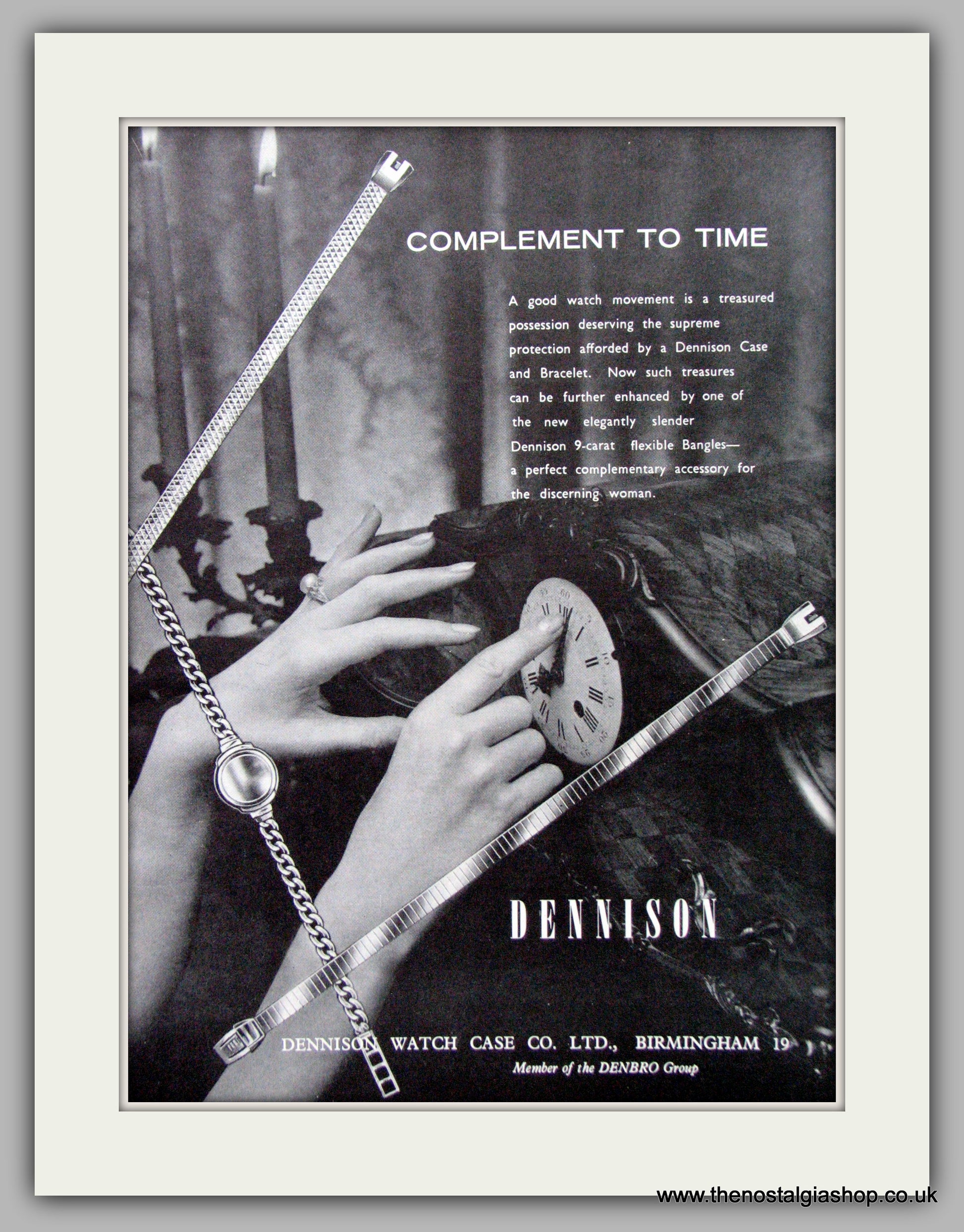 The Dennison Watch Case Company. Ladies gold watch bracelets. Vintage Advert. Classic original advert 1963. Presented in cream bevel cut mount with backing card and clear bag. Ready to fit in 14 x 11 inch frame. Want it framing? If so, buy this then go to Frames Available Category. Click to buy on the suitable frame and we will do the rest. All our adverts, unless clearly stated are Originals from the date shown. They make excellent pieces of wall art and stunning gifts. Many are rare and hard to find and once sold, may not be replaced. Remember you are buying a piece of history. Website watermark is not on original.