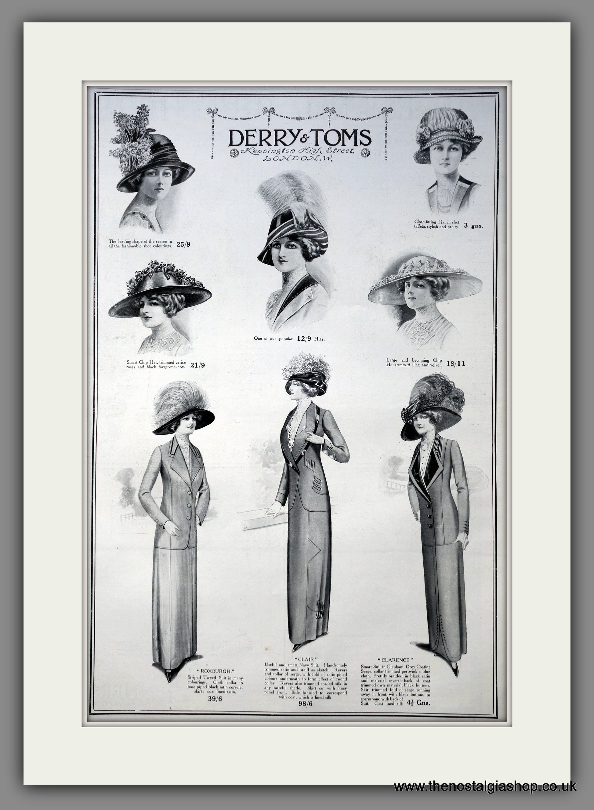 Derry & Toms Millinery and Ladies Fashion. This is a large classic Original advert 1912. Presented in a 20 x 16 Inch, cream bevel cut mount with backing card and clear bag. The mounted advert will be posted via courier and well packed - protected with a sheet of hardboard to keep it rigid. Any questions or enquiries, please get in touch, we are here to help! All our adverts, unless clearly stated are Originals from the date shown. They make excellent pieces of wall art and stunning gifts. Many are rare and hard to find and once sold, may not be replaced. Remember you are buying a piece of history. Website watermark is not on original .