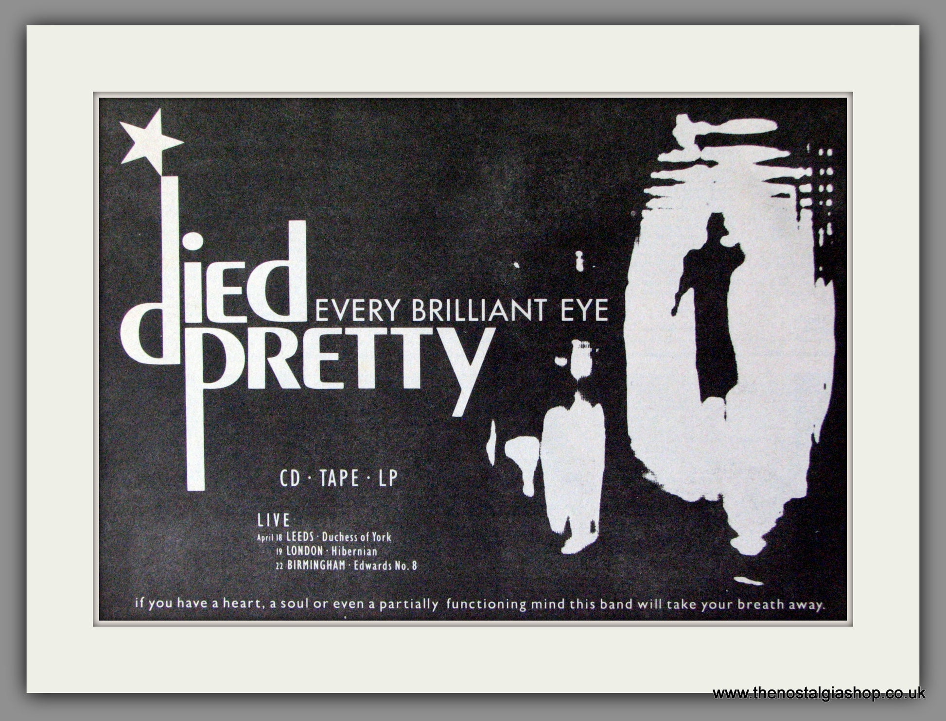 Died Pretty, Every Brilliant Eye. Classic Original advert 1990. Presented and Supplied in cream bevel cut mount with backing card and clear bag. Ready to fit in 14 x 11 inch frame. Want it framing? If so, buy this then go to Frames Available Category. Click to buy on the suitable frame and we will do the rest. All our adverts, unless clearly stated are Originals from the date shown. They make excellent pieces of wall art and stunning gifts. Many are rare and hard to find and once sold, may not be replaced. Remember you are buying a piece of history. Website watermark is not on original.