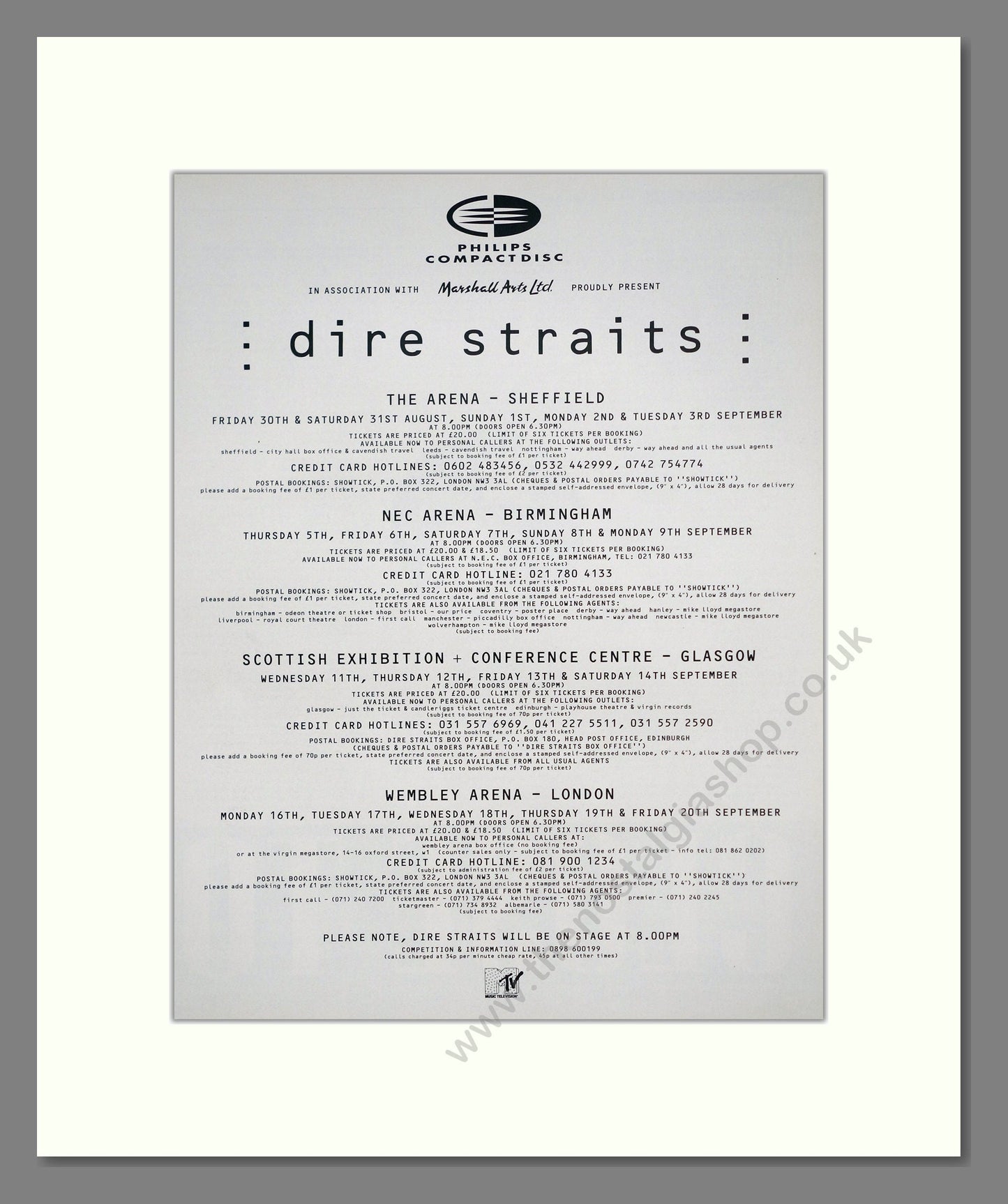 Dire Straits - UK Tour. Vintage Advert. This is a large classic original advert from 1991. Presented and supplied in a cream bevel cut mount with backing card and clear bag. Ready to fit in a 18 x 14 inches frame. The mounted advert will be posted via courier and well packed - protected with a sheet of hardboard to keep it rigid. Any questions or enquiries, please get in touch, we are here to help! All our adverts, unless clearly stated are originals from the date shown. They make excellent pieces of wall art and stunning gifts. Many are rare and hard to find and once sold, may not be replaced. Remember you are buying a piece of history. Website watermark is not on original. Mark Knopfler