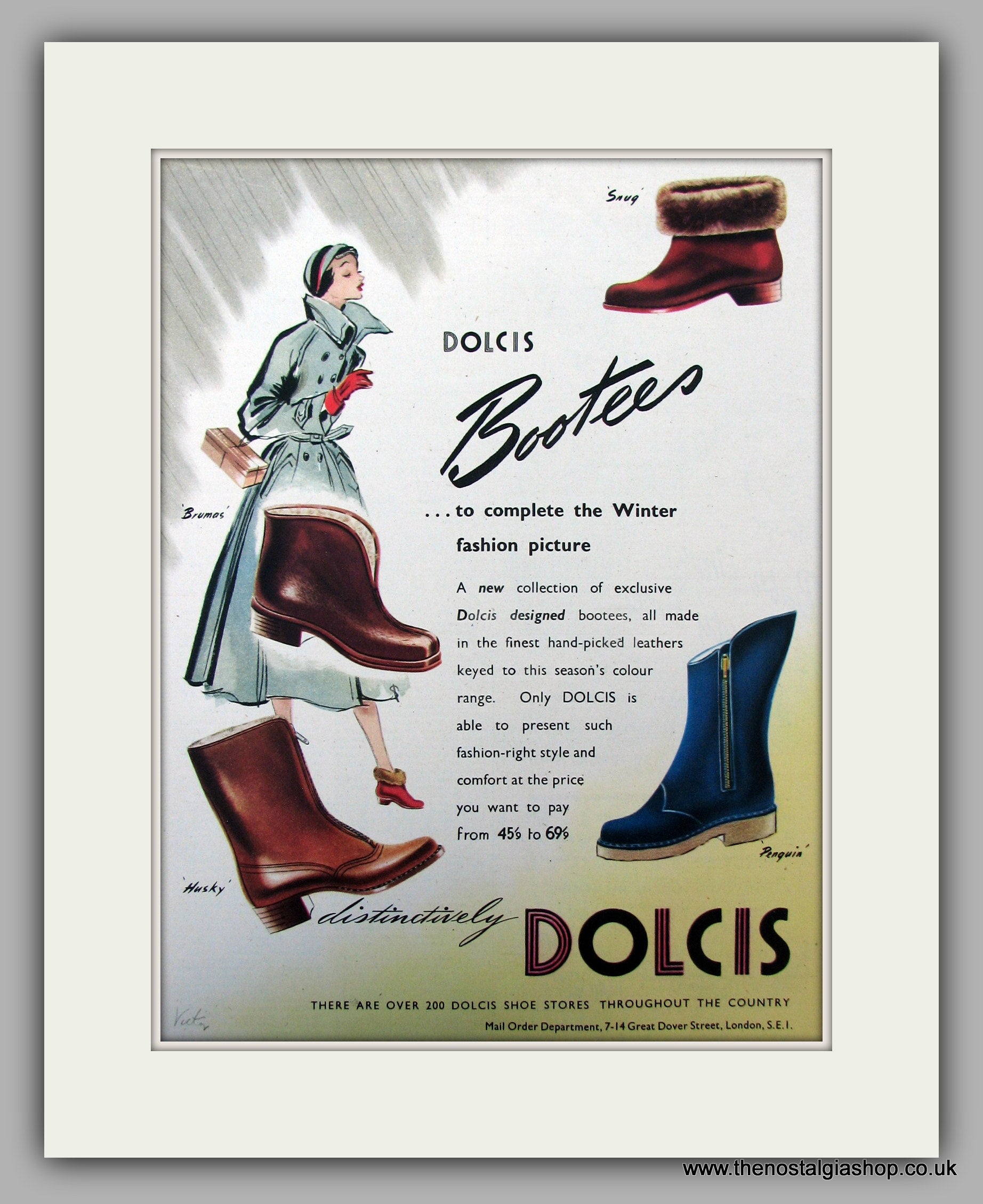 Dolcis Bootees. Vintage Advert. Original Vintage Advert from 1950. Presented and Supplied in a cream bevel cut mount with backing board and clear bag. Size of the Mount is 18 x 14 Inches. The perfect gift. These adverts are all Originals from the dates stated. They are NOT modern reprints. Many are difficult to get hold of ,some are very rare and once sold may not be replaced, Remember, you are buying a piece of historic nostalgia. Lots more adverts available. Please contact us if you don't see the advert you want.