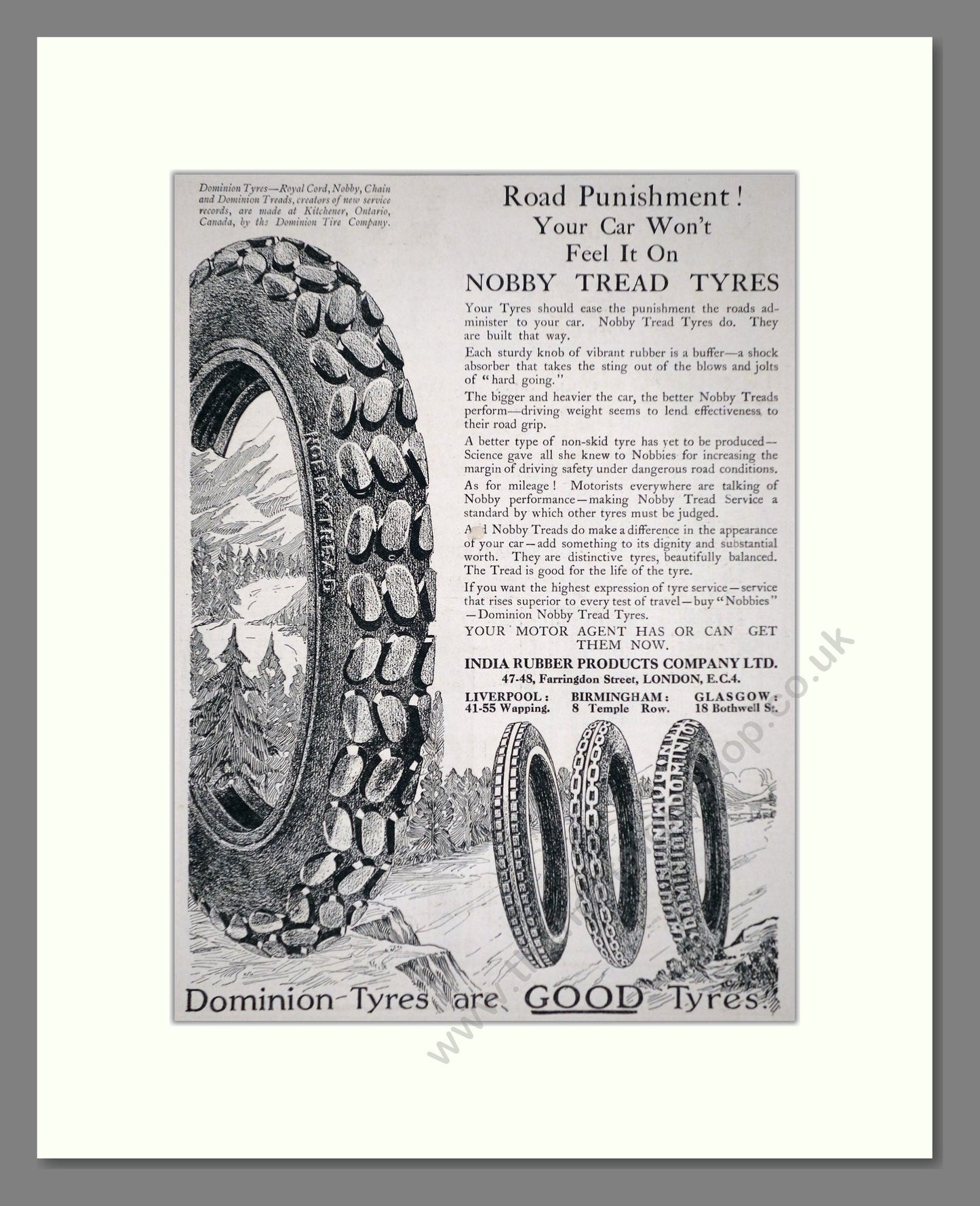 Dominion - Nobby Tread Tyres. Vintage Advert. This is a classic original advert from 1920. Presented and supplied in a cream bevel cut mount with backing card and clear bag. Ready to fit in a 14 x 11 inches frame. The mounted advert will be posted via courier and well packed - protected with a sheet of hardboard to keep it rigid. Any questions or enquiries, please get in touch, we are here to help! All our adverts, unless clearly stated are originals from the date shown. They make excellent pieces of wall art and stunning gifts. Many are rare and hard to find and once sold, may not be replaced. Remember you are buying a piece of history. Website watermark is not on original. Vintage Tyres, Vintage Wheels