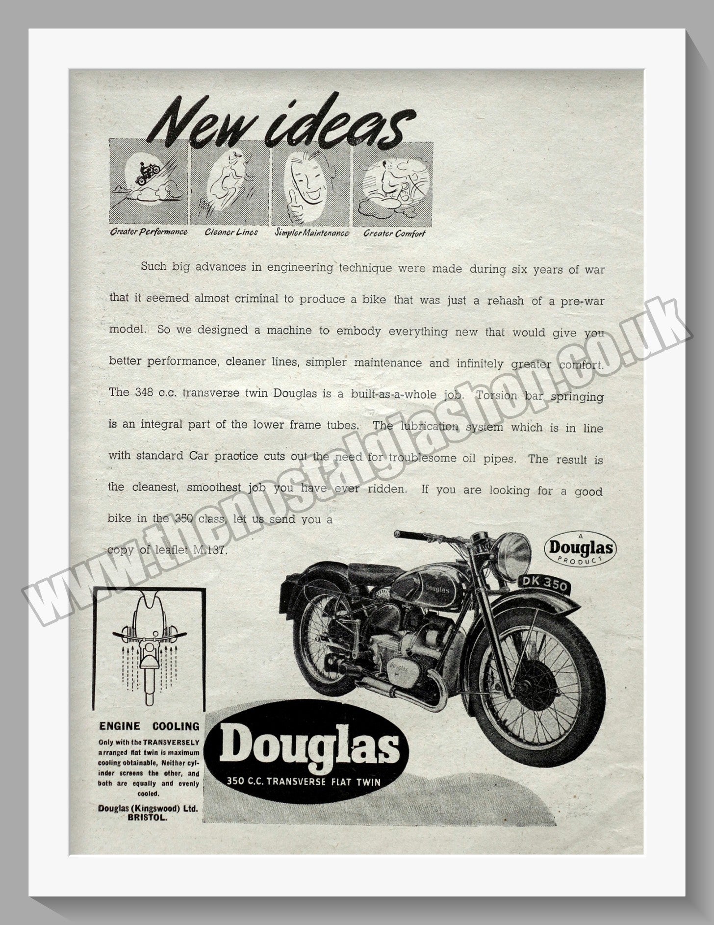 Douglas Motor Cycles. Douglas 350cc Transverse Flat Twin. Original advert from 1947. Presented and Supplied in a cream bevel cut mount with backing board and Clear Bag. Made to fit straight into 14x11 inch frame. The perfect gift. These adverts are all Originals from the dates stated. They are NOT modern reprints. Many are difficult to get hold of , some are very rare and once sold may not be replaced, Remember, you are buying a piece of historic nostalgia. Lots more adverts available. Please contact us if you don't see the advert you want. Website watermark not on Advert.