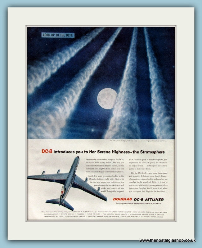 Douglas DC-8 Jetliner. DC-8 introduces you to her serene highness- the Stratosphere. Classic original advert 1958. Presented in a 20 x 16 Inch cream mount with backing board and clear bag. Ready to Frame. All our adverts, unless clearly stated are Originals from the date shown. They make excellent pieces of wall art and stunning gifts. Many are rare and hard to find and once sold, may not be replaced. Remember you are buying a piece of history. Website watermarks are not on original. Adverts will be well packed with hardboard to keep rigid in the post.
