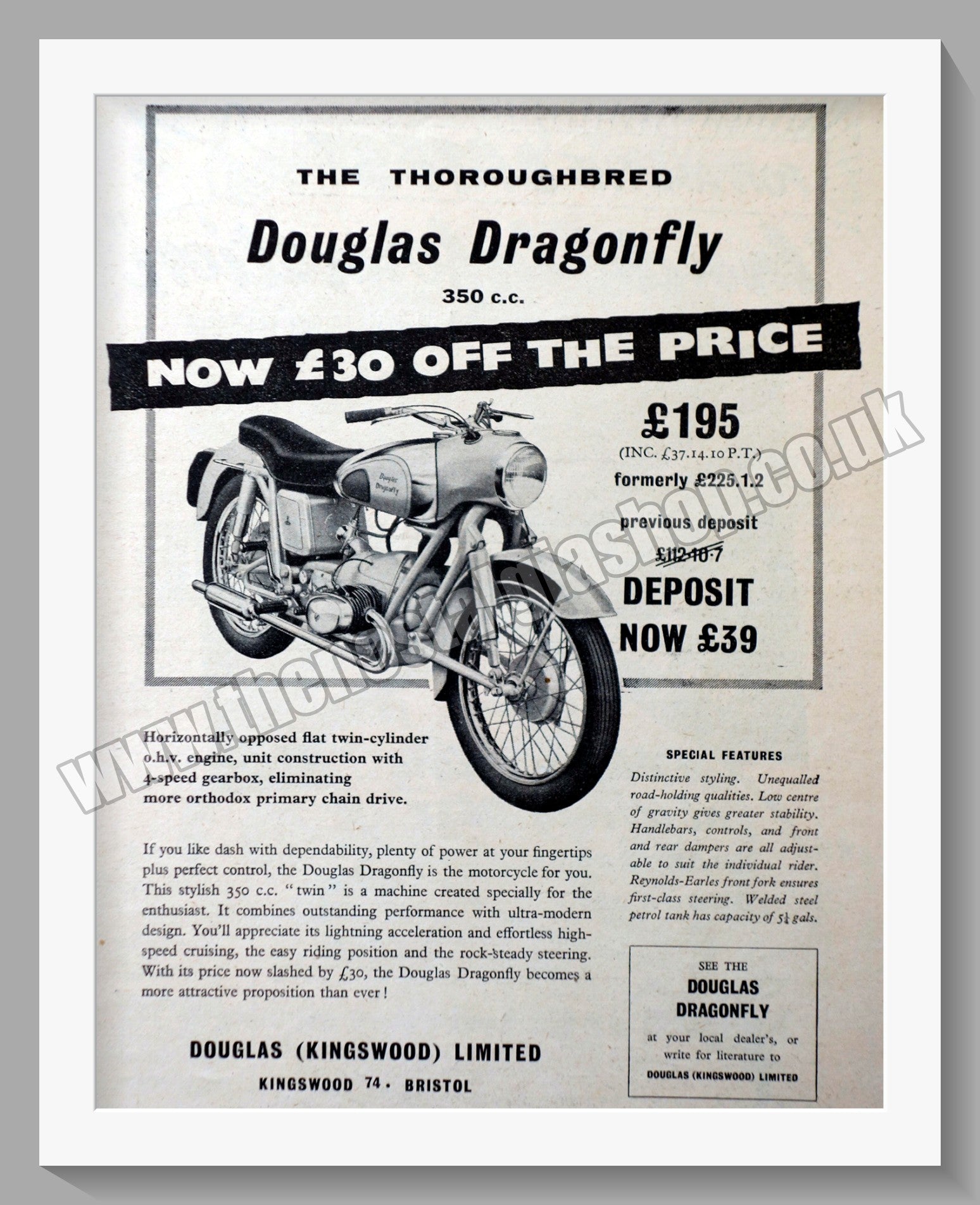 Douglas Motor Cycles. Douglas Dragonfly. Original advert from 1957. Presented and Supplied in a cream bevel cut mount with backing board and Clear Bag. Made to fit straight into 14x11 inch frame. The perfect gift.- These adverts are all taken from Original publications of the dates stated. They are NOT modern reprints. Many are difficult to get hold of , some are very rare and once sold may not be replaced, Remember, you are buying a piece of historic nostalgia. Lots more adverts available. Please contact us if you don't see the advert you want. Website watermark not on Advert.